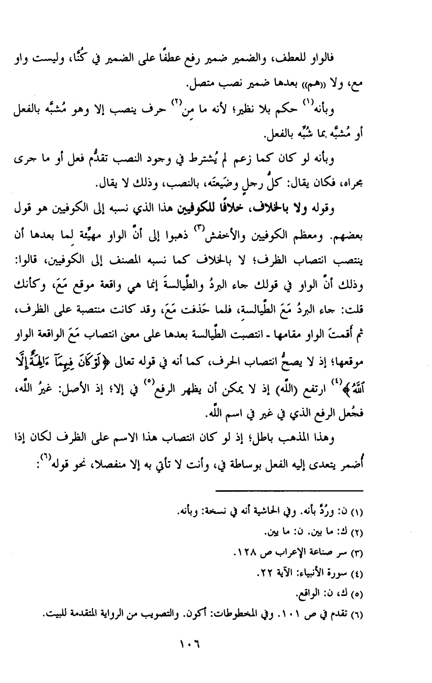 وقوله ولا بالخلاف، خلافاً للكوفيين هذا الذي نسبه إلي الكوفيين هو قول بعضهم. ومعظم الكوفيين والأخفش ذهبوا إلي أن الواو مهيأة لما بعدها أن ينتصب انتصاب الظرف؛ لا بالخلاف كما نسبه المصنف إلي الكوفيين، قالوا: وذلك أن الواو في قولك جاء البرد والطيالسة إنما هي واقعة موقع مع، وكأنك قلت: جاء البرد مع الطيالسة، فلما حذفت مع، وقد كانت منتصبة علي الظرف، ثم أقمت الواو مقامها- انتصبت الطيالسة بعدها علي أمعني انتصاب مع الواقعة الواو موقعها؛ إذ لا يصح انتصاب الحرف، كما أنه في قوله تعالي {لَوْ كَانَ فِيهِمَا آلِهَةٌ إلاَّ اللَّهُ} ارتفع (الله) إذ لا يمكن أن يظهر الرفع في إلا؛ إذ الأصل: غير الله، فجعل الرفع الذي في غير اسم الله.