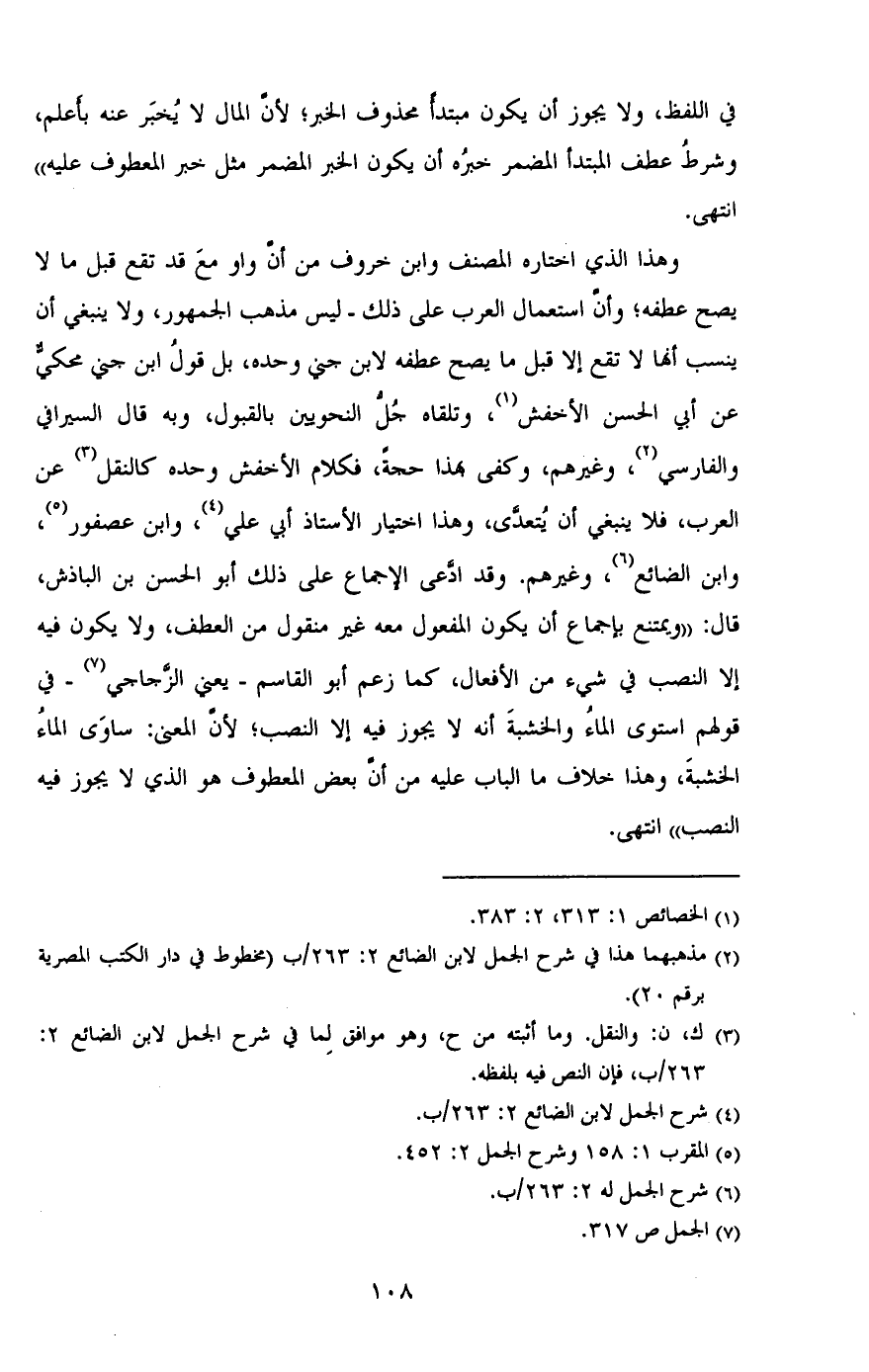 وهذا الذي اختاره المصنف وابن خروف من أن واو مع قد تقع قبل ما لا يصح عطفه؛ وأن استعمال العرب علي ذلك- ليس مذهب الجمهور، ولا ينبغي أن ينسب أنها لامتقع إلا قبل ما يصح عطفه لابن جني وحده، بل قول ابن جني محكي عن أبي الحسن الأخفش، وتلقاه جل النحويين بالقبول، وبه قال السيرافي والفارسي، وغيرهم، وكفي بهذا حجة، فكلام الأخفش وحده كالنقل عن العرب، فلا ينبغي أن يتعدي، وهذا اختيار الأستاذ أبي علي، واين عصفور، وابن الضائع، وغيرهم. وقد ادعي الإجماع علي ذلك أبو الحسن بن الباذنش، قال: "ويمتنع بإجماع أن يكون المفعول معه غير منقول من العطف، ولا يكون فيه إلا النصب في شئ من الأفعال، كما زعم أبو القاسم- يعني الزجاجي- في قولهم استوي الماء والخشبة أنه لا يجوز فيه النصب؛ لأن المعني: ساوي الماء الخشبة، وهذا خلاف ما الباب عليه من أن بعض المعطوف هو الذي لا يجوز فيه النصب" انتهى.