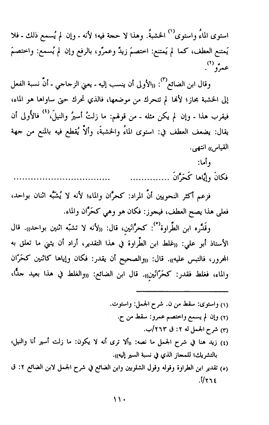 وقدره ابن الطراوة: كحرانين، قال: ((لأنه لا تشبه اثنين بواحد)). قال الأستاذ أبو علي: ((غلط ابن الطراوة في هذا التقدير، أراد أن يثني ما تعلق به المجرور، فالتبس عليه)). قال: ((والصحيح أن يقدر: فكان وإياها كاثنين كحران والماء، فغلط فقدر: كحرانين)). قال ابن الضائع: ((والغلط في هذا بعيد جدًا،