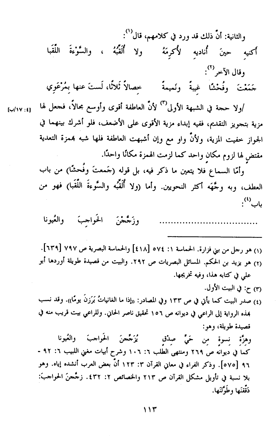 وأما السماع فلا يتعين ما ذكر فيه، بل قوله (جمعت وفحشًا) من باب العطف، وبه وجهه أكثر النحويين. وأما (ولا ألقبه والسوءة اللقبا) فهو من باب: