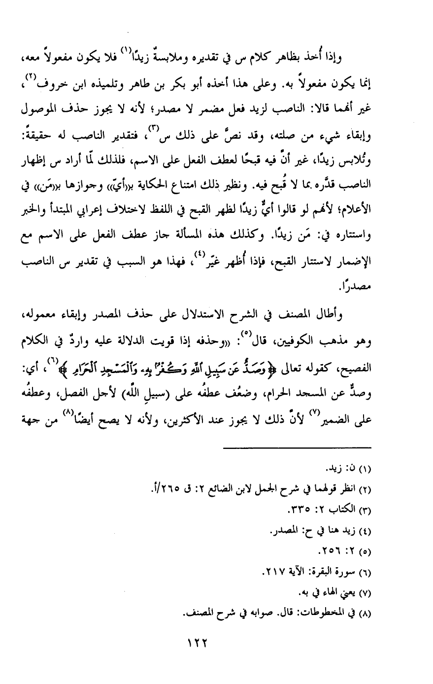 وأطال المصنف في الشرح الاستدلال على حذف المصدر وإبقاء معموله، وهو مذهب الكوفيين، قال: ((وحذفه إذا قويت الدلالةً عليه وارد في الكلام الفصيح، كقوله تعالى {وَصَدٌّ عَن سَبِيلِ اللَّهِ وَكُفْرٌ بِهِ وَالْمَسْجِدِ الْحَرَامِ}، أي: وصد عن المسجد الحرام، وضعف عطفه على (سبيل الله) لأجل الفصل، وعطفه على الضمير لأن ذلك لا يجوز عند الأكثرين، ولأنه لا يصح أيضًا، من جهة