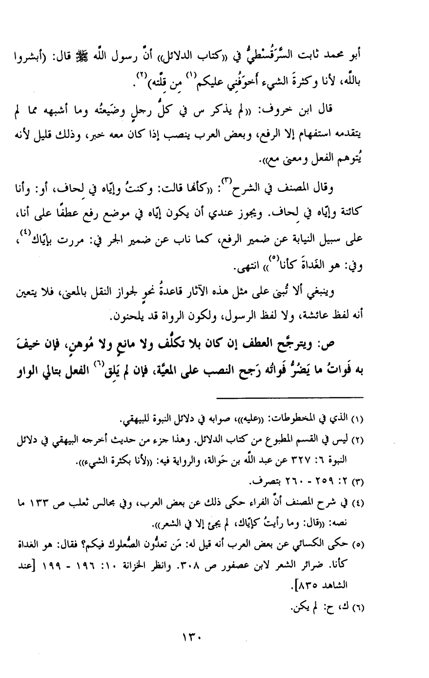 أبو محمد ثابت السرقسطي في "كتاب الدلائل" أن رسول الله صلى الله عليه وسلم قال: (أبشروا بالله, لأنا وكثرة الشيء أخوفني عليكم من قتله).