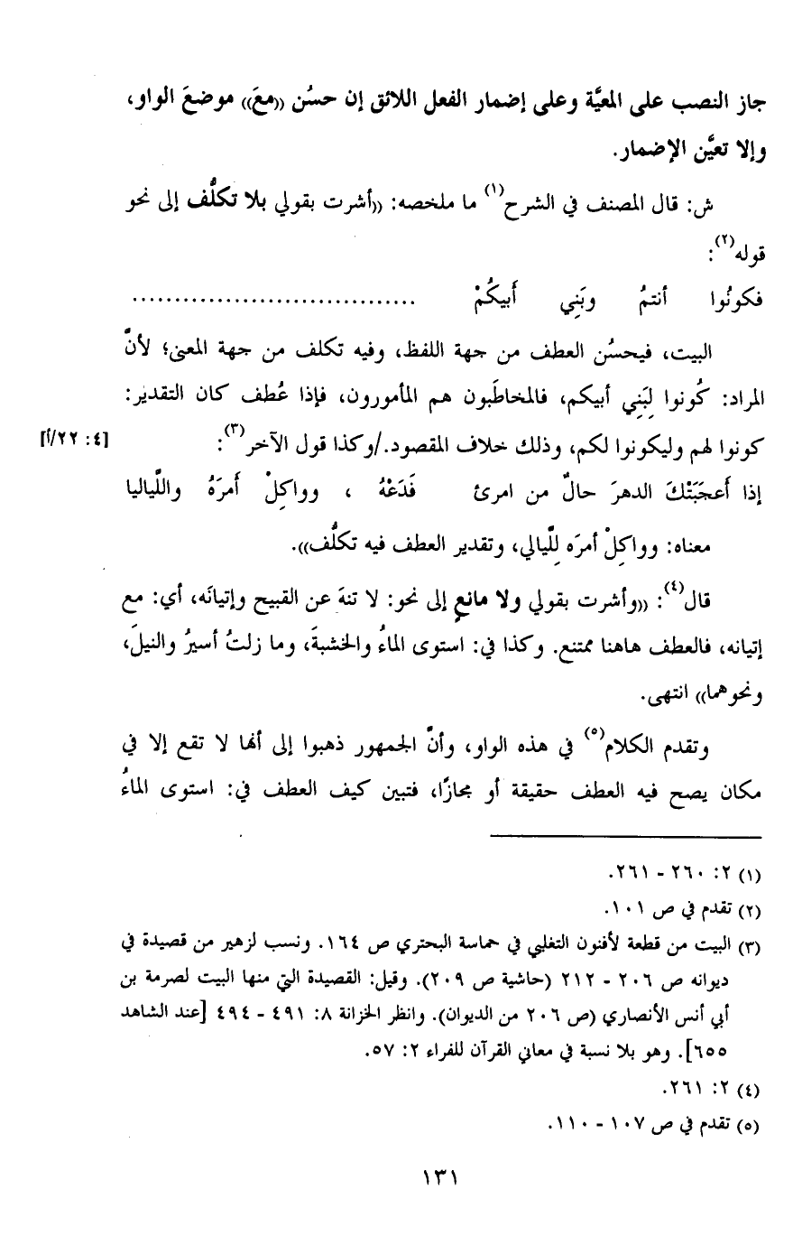 جاز النصب على المعية وعلى إضمار الفعل اللائق إن حسن "مع" موضع الواو, وإلا تعين الإضمار. ش: قال المصنف في الشرح ما ملخصه: "أشرت بقولي بلا تكلف إلى نحو قوله: