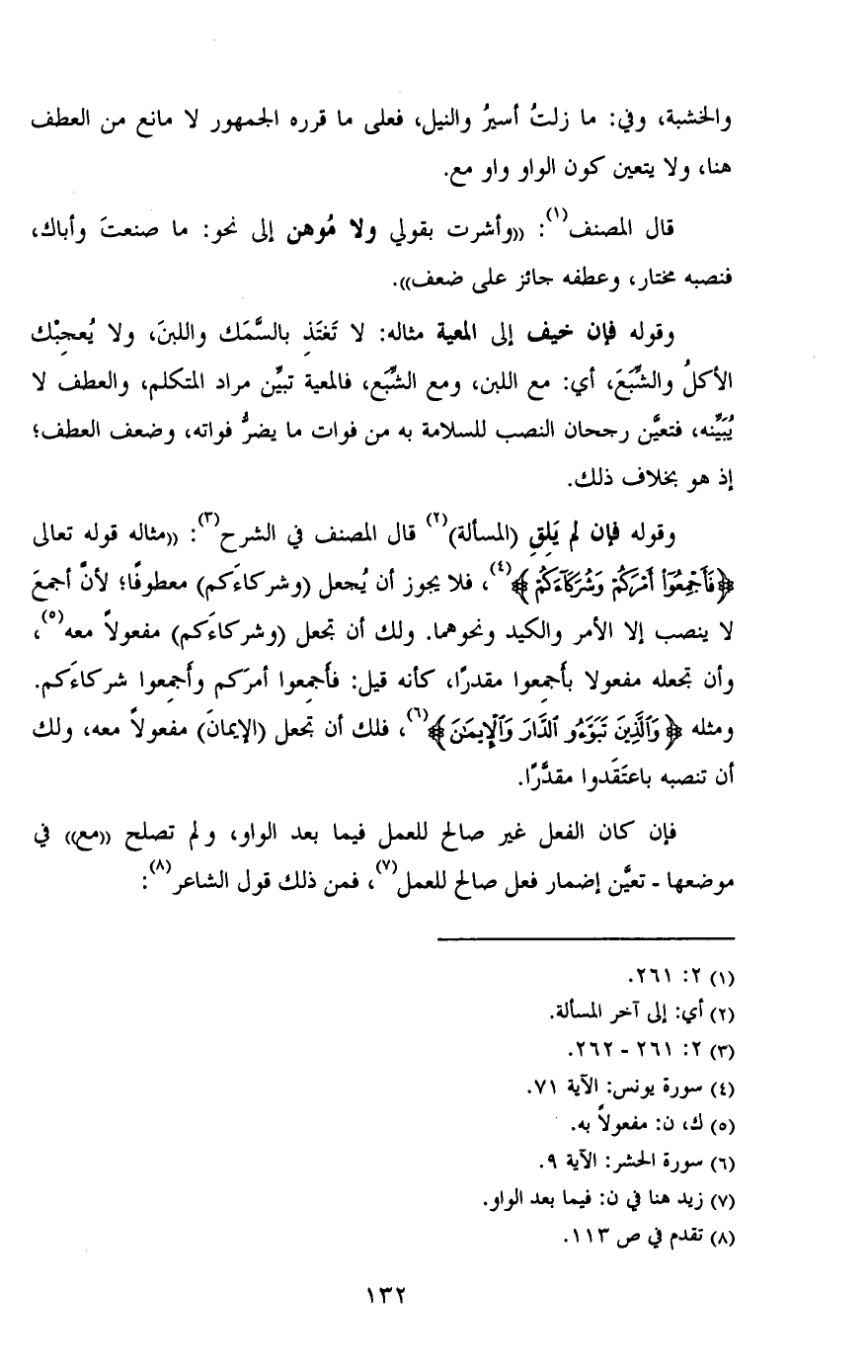 وقوله فإن لم يلق (المسألة) قال المصنف في الشرح: "مثاله قوله تعالى {فَأَجْمِعُوا أَمْرَكُمْ وشُرَكَاءَكُمْ}، فلا يجوز أن يجعل (وشركائكم) عطوفا؛ لأن أجمع لا ينصب إلا الأمر والكيد ونحوهما, ولك أن تجعل (وشركاءكم) مفعولًا معه, وأن تجعله مفعولًا فأجمعوا مقدرًا, كأنه قيل: فأجمعوا أمركم وأجمعوا شركاءكم, ومثله {والَّذِينَ تَبَوَّءُوا الدَّارَ والإيمَانَ}، فلك أن تجعل (الإيمان) مفعولًا معه, ولك أن تنصبه باعتقدوا مقدرًا.