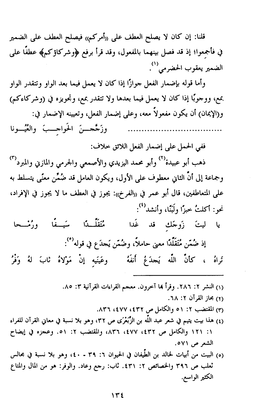وأما قوله بإضمار الفعل جوازًا إذا كان لا يعمل فيما بعد الواو وتتقدر الواو بمع, ووجوبًا إذا كان لا يعمل فيما بعدها ولا تتقدر بمع, وتجويزه في (وشركاءكم) و (الإيمان) أن يكون مفعولًا معه, وعلى إضمار الفعل, وتعيينه الإضمار في: