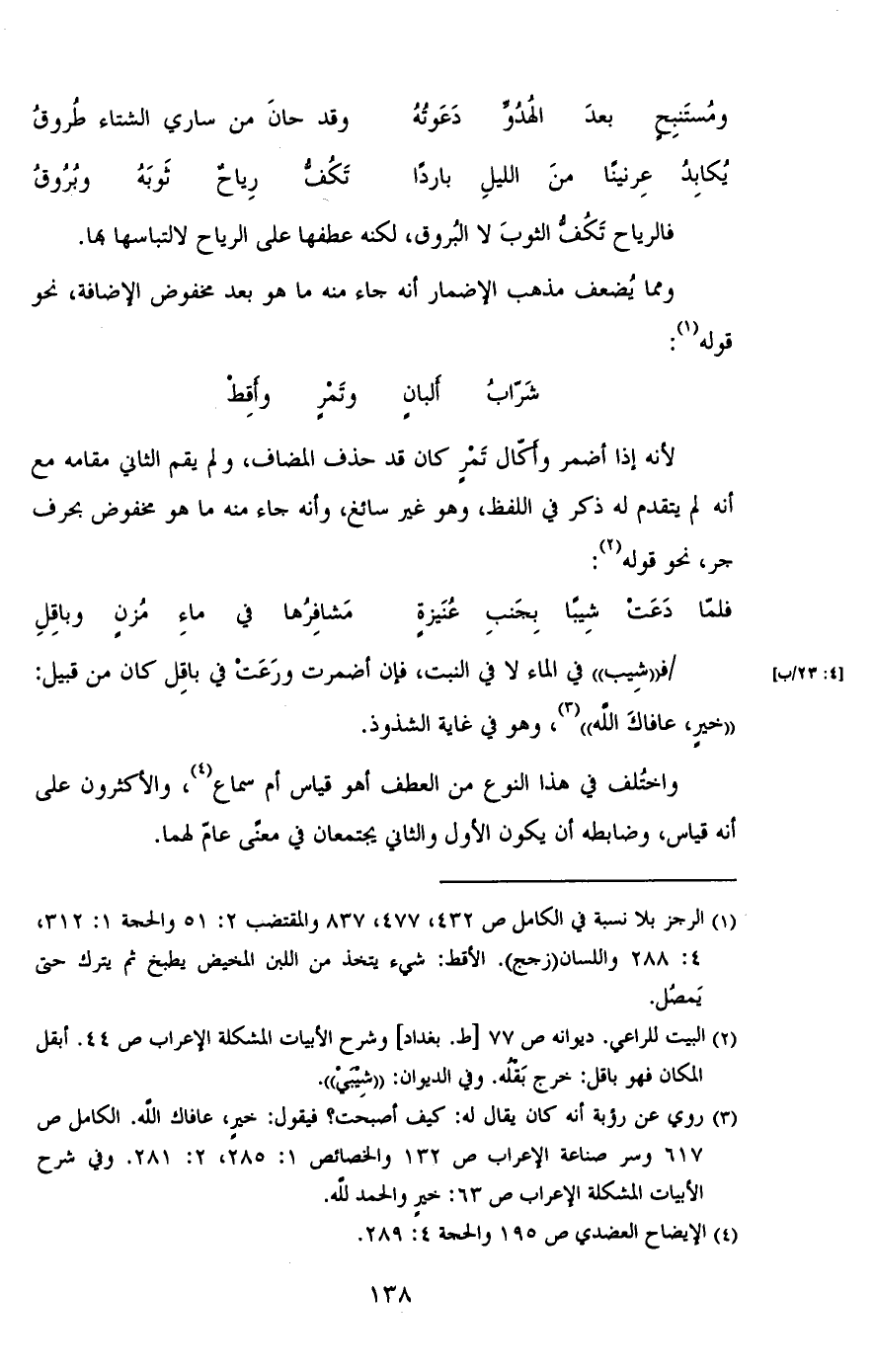 [4: 23/ ب] /فـ "شيب" في الماء لا في النبت, فإن أضمرت ورعت في باقل كان من قبيل: "خير, عافاك الله"، وهو في غاية الشذوذ.