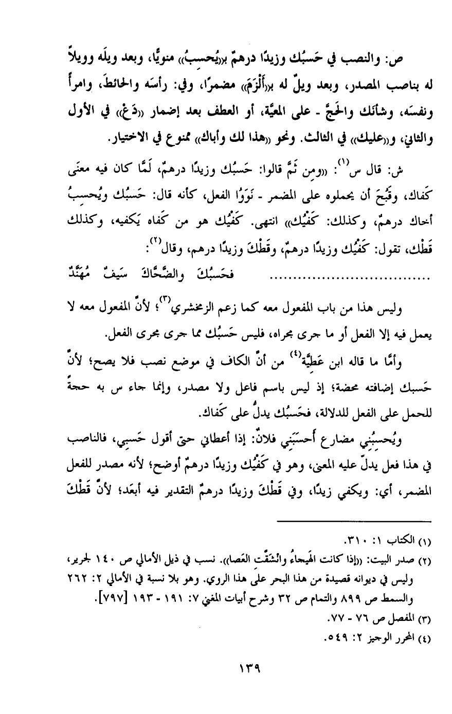 ش: قال س: "ومن ثم قالوا: حسبك وزيدًا درهم, لما كان فيه معنى كفاك, وقبح أن يحملوه على المضمر - نووا الفعل, كأنه قال: حسبك ويحسب أخاك درهم, وكذلك: كفيك" انتهى.