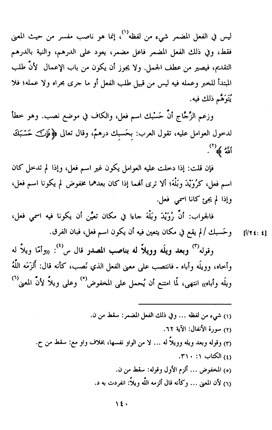 وزعم الزجاج أن حسبك اسم فعل, والكاف في موضع نصب, وهو خطأ لدخول العوامل عليه, تقول العرب: بحسبك درهم, وقال تعالى {فَإنَّ حَسْبَكَ اللَّهُ}.
