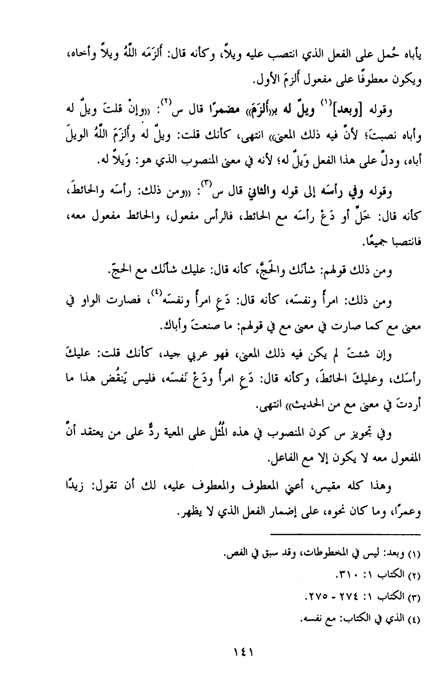 وإن شئت لم يكن فيه ذلك المعنى, فهو عربي جيد, كأنك قلت: عليك رأسك, وعليك الحائط, وكأنه قال: دع امرأ ودع نفسه, فليس ينقض هذا ما أردت في معنى مع من الحديث" انتهى.