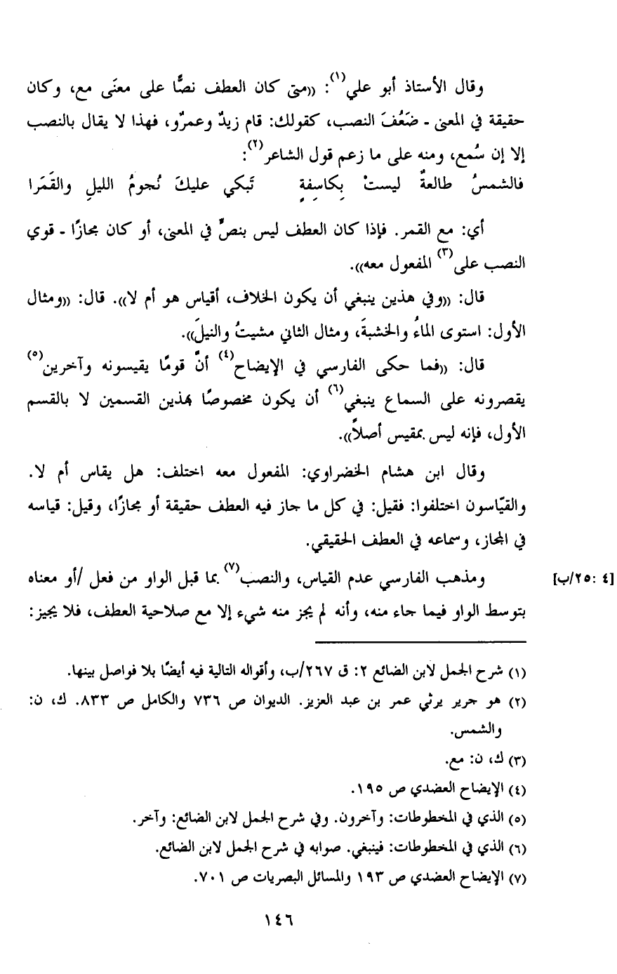 وقال الأستاذ أبو علي: "متى كان العطف نصًا على معنى مع, وكان حقيقة في المعنى - ضعف النصب, كقولك: قام زيد وعمرو, فهذا لا يقال بالنصب إلا إن سمع, ومنه على ما زعم قول الشاعر:
