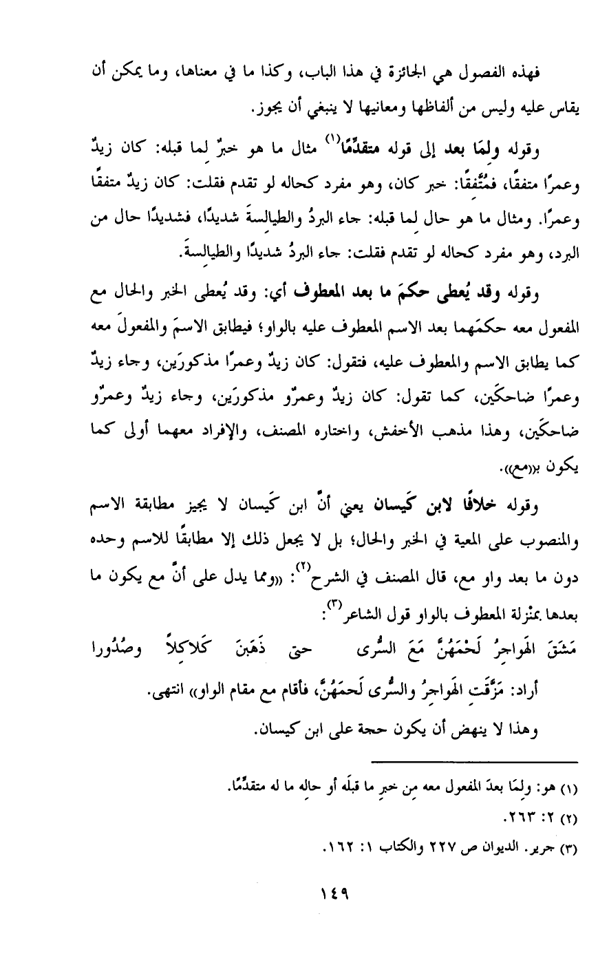 وقوله خلافًا لابن كيسان يعني أن ابن كيسان لا يجيز مطابقة الاسم والمنصوب على المعية في الخبر والحال؛ بل لا يجعل ذلك إلا مطابقًا للاسم وحده دون ما بعد واو مع, قال المصنف في الشرح: "ومما يدل على أن مع يكون ما بعدها بمنزلة المعطوف بالواو قول الشاعر: