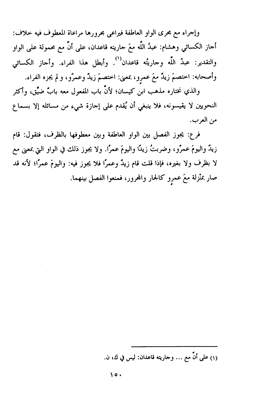 وإجراء مع مجرى الواو العاطفة فيراعى مجرورها مراعاة المعطوف فيه خلاف: أجاز الكسائي وهشام: عبد الله مع جاريته قاعدان, على أن مع محمولة على الواو والتقدير: عبد الله وجاريته قاعدان, وأبطل هذا الفراء, وأجاز الكسائي وأصحابه: اختصم زيد مع عمرو, بمعنى: اختصم زيد وعمرو, ولم يجز الفراء.