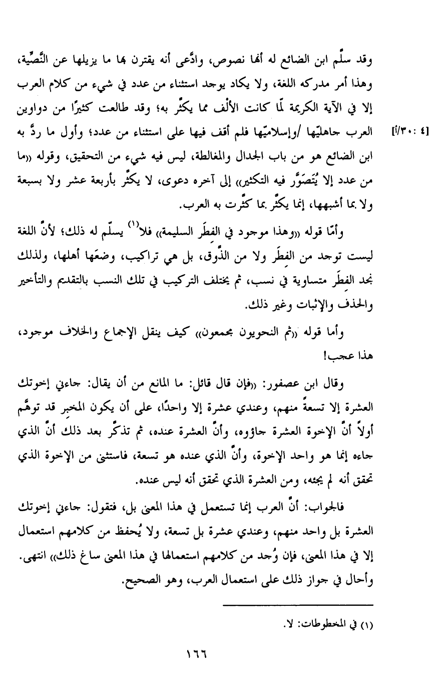 وقد سلم ابن الضائع له أنها نصوص، وادعى أنه يقترن بها ما يزيلها عن النصية، وهذا أمر مدركه اللغة، ولا يكاد يوجد استثناء من عدد في شيء من كلام العرب إلا في الآية الكريمة لما كانت الألف مما يكثر به؛ وقد طالعت كثيرًا من دواوين العرب جاهليها / [4: 30/ أ] وإسلاميها فلم أقف فيه على استثناء من عدد؛ وأول ما رد به ابن الضائع هو من باب الجدال والمغالطة، ليس فيه شيء من التحقيق، وقوله "ما من عدد إلا يُتصور فيه التكثير" إلى آخره دعوى، لا يكثر بأربعة عشر ولا بسبعة لا بما أشبهها، إنما يكثر بما كثرت به العرب.