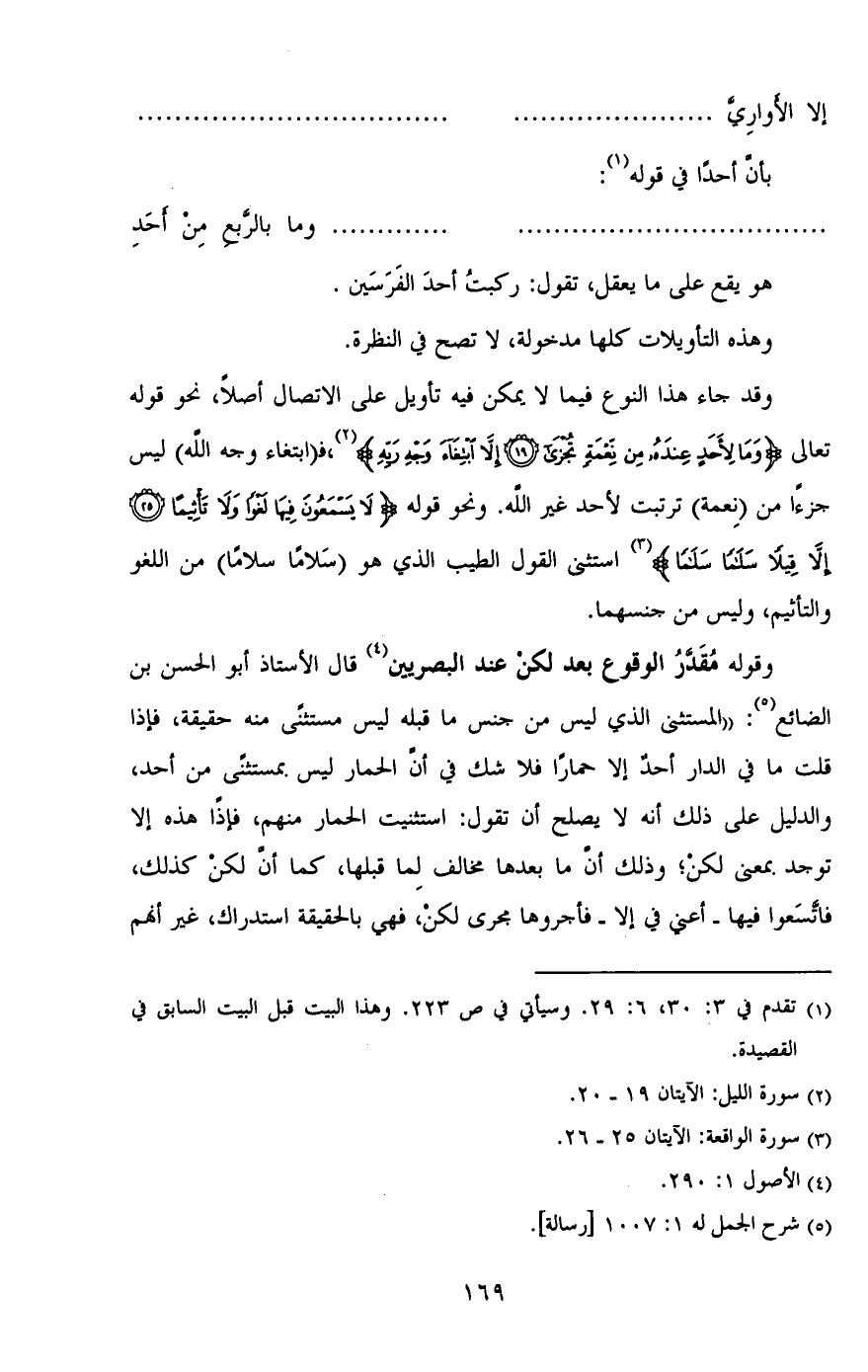 وقوله مُقدر الوقوع بعد لكن عند البصريين قال الأستاذ أبو الحسن بن الضائع: "المستثنى الذي ليس من جنس ما قبله ليس مستثنى منه حقيقة، فإذا قلت ما في الدار أحدٌ إلا حمارًا فلا شك في أن الحمار ليس بمستثنى من أحد، والدليل على ذلك أنه لا يصلح أن تقول: استثنيت الحمار منهم، فإذا هذه إلا توجد بمعنى لكن؛ وذلك أن ما بعدها مخالف لما قبلها، كما أن لكن كذلك، فاتسعوا فيها - أعني في إلا - فأجروها مجرى لكن، فهي بالحقيقة استدراك، غير أنهم