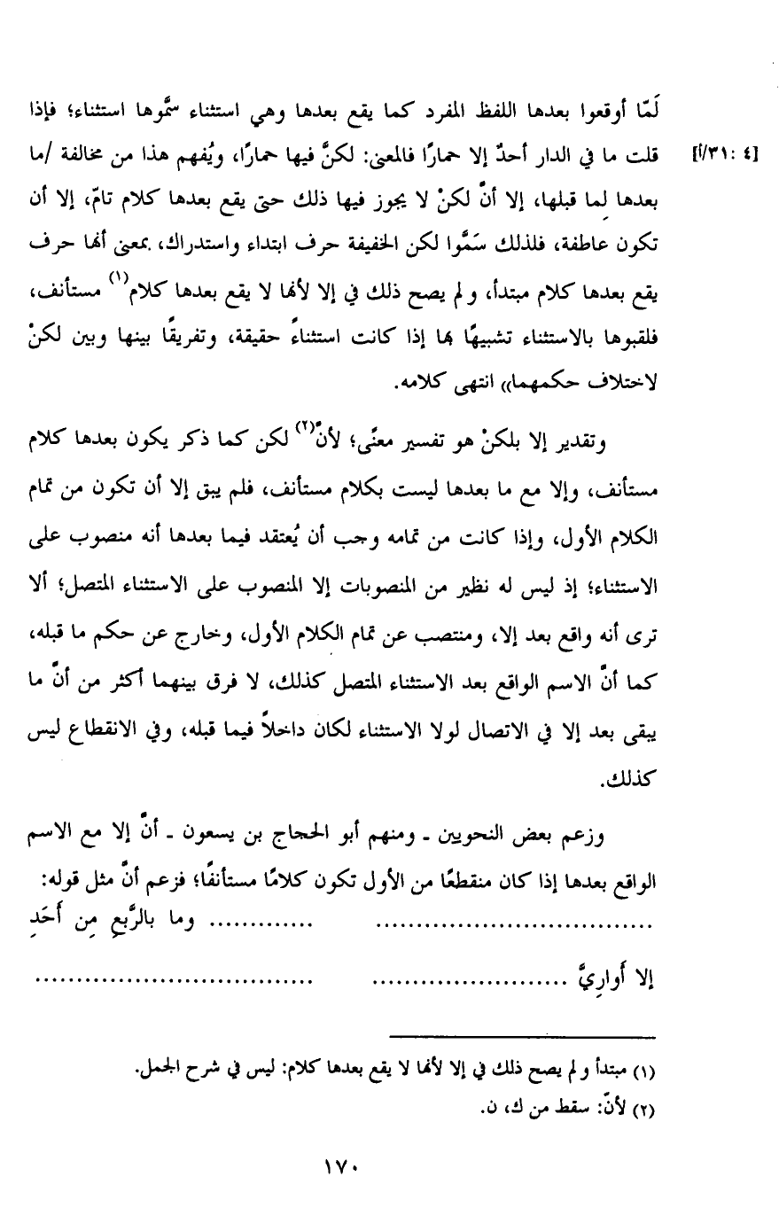 لما أوقعوا بعدها اللفظ المفرد كما يقع بعدها وهي استثناء سموها استثناء؛ فإذا قلت ما في الدار أحدٌ إلا حمارًا فالمعنى: لكن فيها حمارًا، ويُفهم هذا من مخالفة / [4: 31/ أ] ما بعدها لما قبلها، إلا أن لكن لا يجوز فيها ذلك حتى يقع بعدها كلام تام، إلا أن تكون عاطفة، فلذلك سموا لكن الخفيفة حرف ابتداء واستدراك، بمعنى أنها حرف يقع بعدها كلام مبتدأ، ولم يصح ذلك في إلا لأنها لا يقع بعدها كلام مستأنف، فلقبوها بالاستثناء تشبيهًا بها إذا كانت استثناءً حقيقة، وتفريقًا بينها وبين لكن لاختلاف حكمهما" انتهى كلامه.