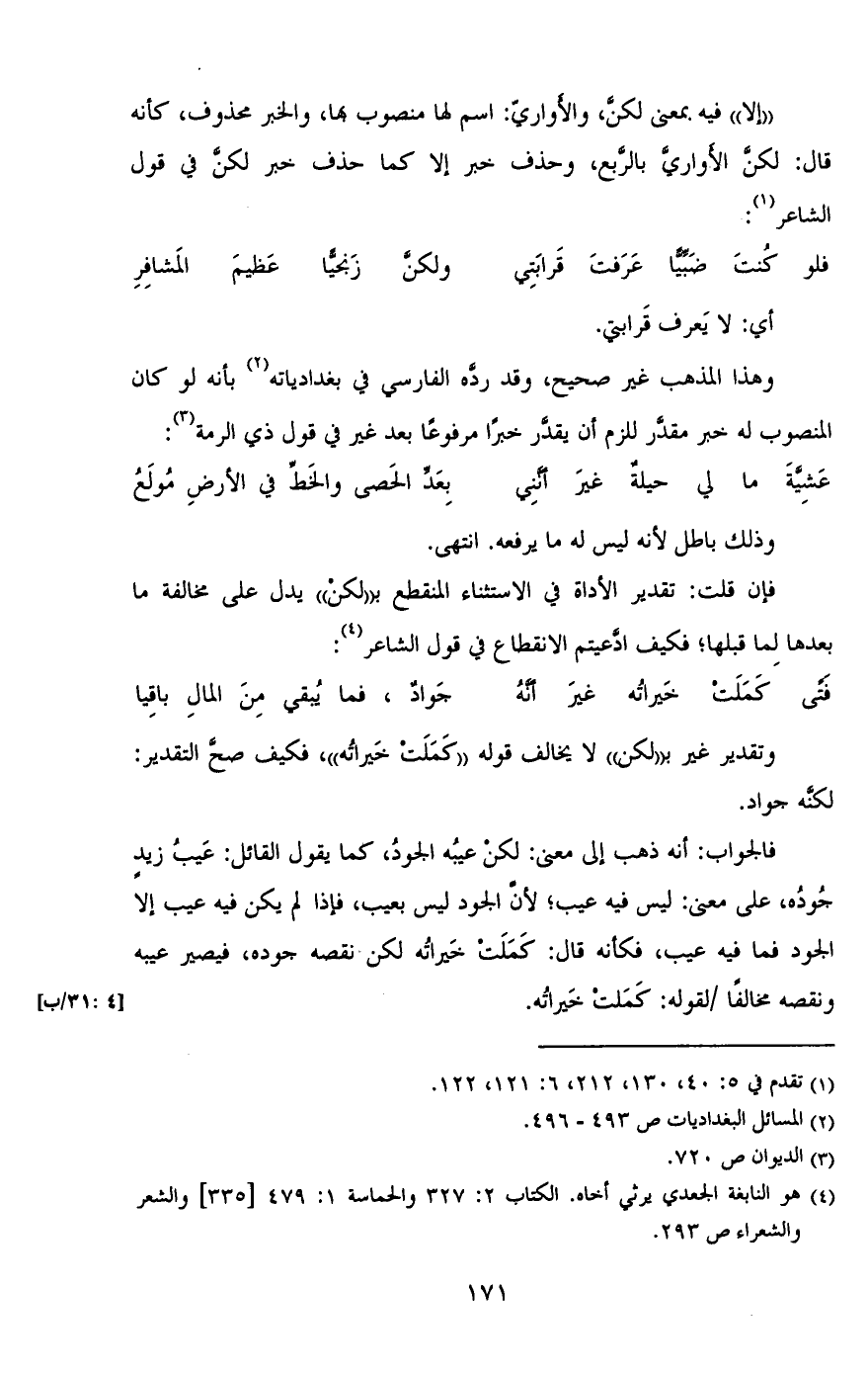 "إلا" فيه بمعنى لكن، الأواري: اسم لها منصوب بها، والخبر محذوف، كأنه قال: لكن الأواري بالربع، وحذف خبر إلا كما حذف خبر لكن في قول الشاعر: