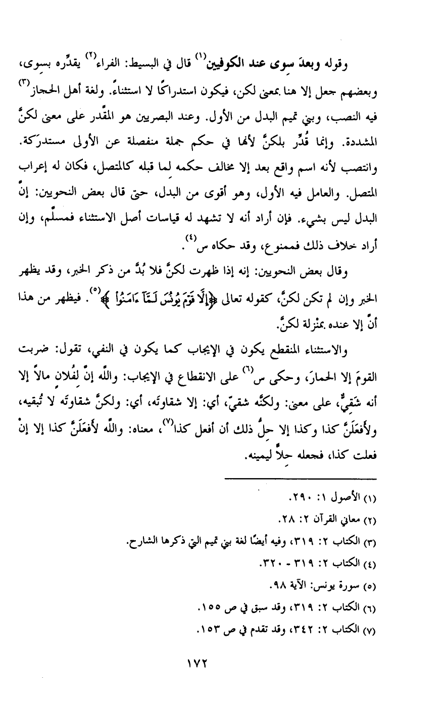 وقوله وبعد سوى عند الكوفيين قال في البسيط: الفراء يقدره بسوى، وبعضهم جعل إلا هنا بمعنى لكن، فيكون استدراكًا لا استثناءً. ولغة أهل الحجاز فيه النصب، وبني تميم البدل من الأول. وعند البصريين هو المقدر على معنى لكن المشددة. وإنما قُدر بلكن لأنها في حكم جملة منفصلة عن الأولى مستدركة. وانتصب لأنه اسم واقع بعد إلا مخالف حكمه لما قبله كالمتصل، فكان له إعراب المتصل. والعامل فيه الأول، وهو أقوى من البدل، حتى قال بعض النحويين: إن البدل ليس بشيء. فإن أراد أنه لا تشهد له قياسات أصل الاستثناء فمسلم، وإن أراد خلاف ذلك فممنوع، وقد حكاه س.