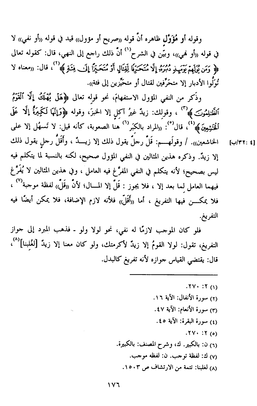 وذكر من النفي المؤول الاستفهام، نحو قوله تعالى {هَلْ يُهْلَكُ إلاَّ القَوْمُ الظَّالِمُونَ}، وقولك: زيدٌ غير آكلٍ إلا الخبز، وقوله: {وإنَّهَا لَكَبِيرَةٌ إلاَّ عَلَى الخَاشِعِينَ}، قال: "المراد بالكبر هنا الصعوبة، كأنه قيل: لا تسهل إلا على الخاشعين". / [4: 32/ ب] وقولهم: قل رجلٌ يقول لك إلا زيدٌ، وأقل رجلٍ يقول ذلك إلا زيدٌ. وذكره هذين المثالين في النفي المؤول صحيح، لكنه بالنسبة لما يتكلم فيه ليس بصحيح؛ لأنه يتكلم في النفي المفرغٍ فيه العامل، وفي هذين المثالين لا يُفرغ فيهما العامل لما بعد إلا، فلا يجوز: قل إلا المال؛ لأن "قل" لفظة موجبة، فلا يمكن فيها التفريغ، أما "أقل" فلأنه لازم الإضافة، فلا يمكن أيضًا فيه التفريغ.