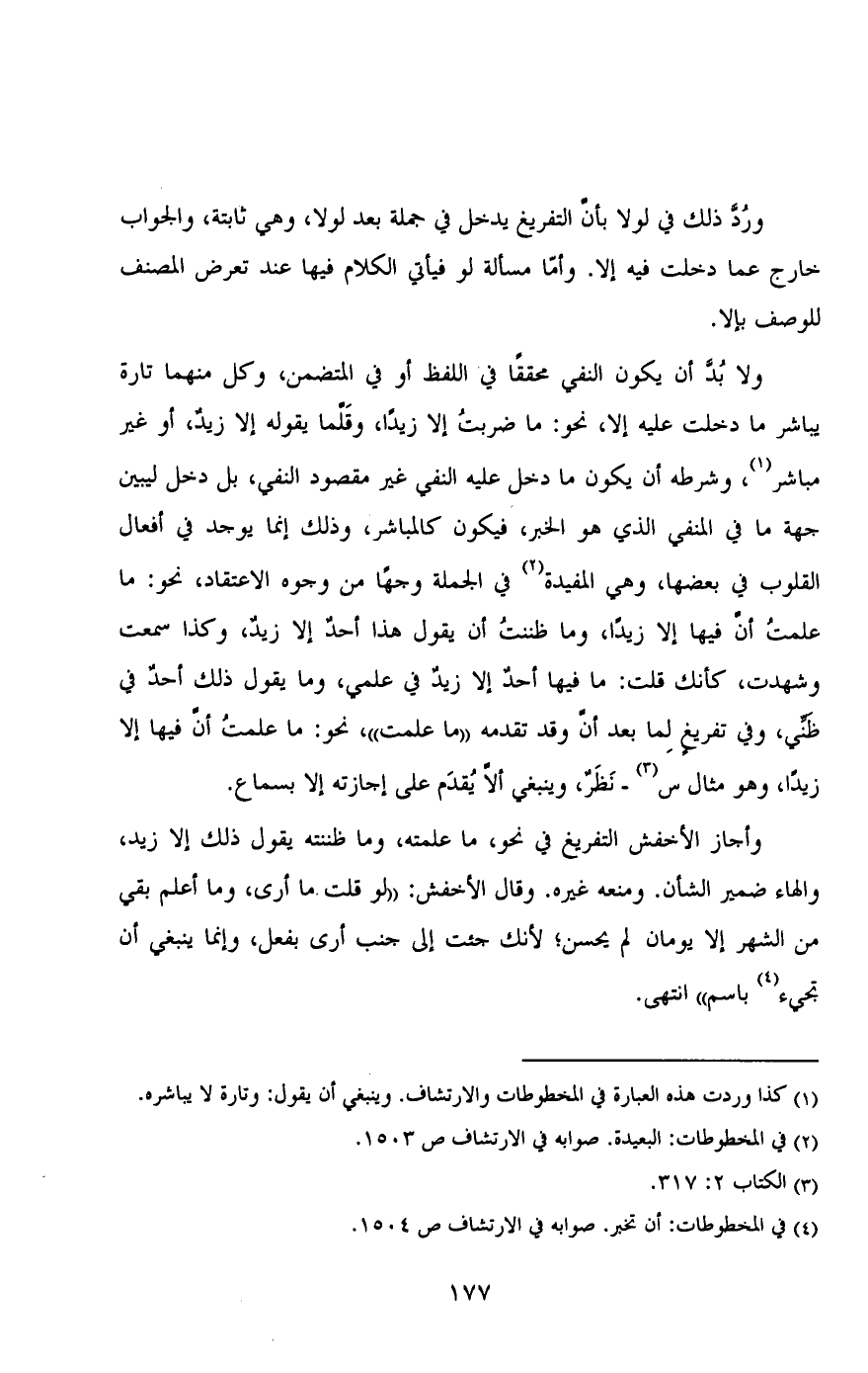 ولابد أن يكون النفي محققًا في اللفظ أو في المتضمن، وكل منهما تارة يباشر ما دخلت عليه إلا، نحو: ما ضربت إلا زيدًا، وقلما يقوله إلا زيدٌ، أو غير مباشر، وشرطه أن يكون ما دخل عليه النفي غير مقصود النفي، بل دخل ليبين جهة ما في المنفي الذي هو الخبر، فيكون كالمباشر، وذلك إنما يوجد في أفعال القلوب في بعضها، وهي المفيدة في الجملة وجهًا من وجوه الاعتقاد، نحو: ما علمت أن فيها إلا زيدٌ، وكذا سمعت وشهدت، كأنك قلت: ما فيها أحدٌ إلا زيدٌ في علمي، وما يقول ذلك أحدٌ في ظني، وفي تفريغٍ لما بعد أن وقد تقدمه "ما علمت"، نحو: ما علمت أن فيها إلا يدًا، وهو مثال س - نظرٌ، وينبغي ألا يُقدم على إجازته إلا بسماع.