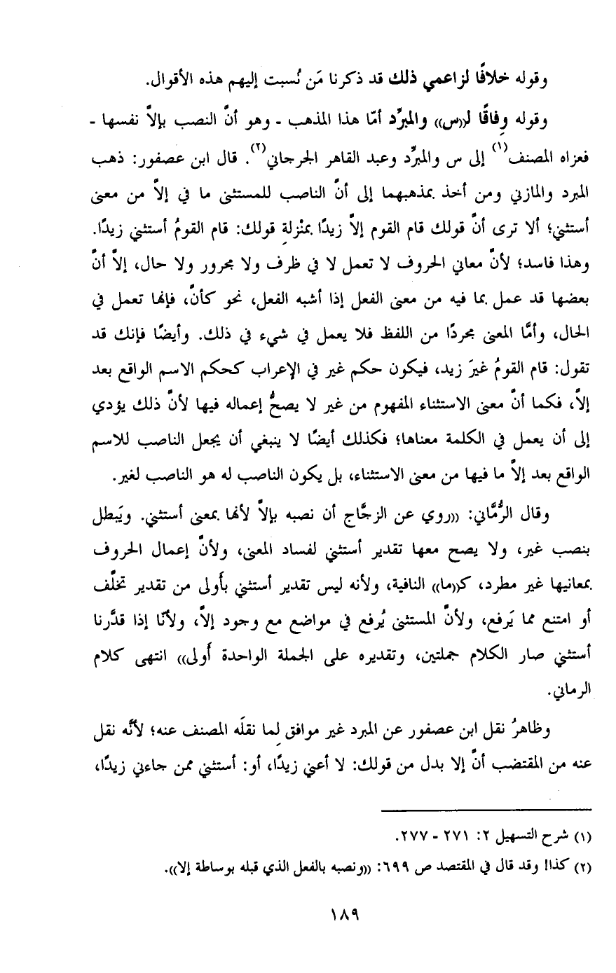 وقوله وفاقًا لـ"س" والمبرد أما هذا المذهب - وهو أن النصب بإلا نفسها - فعزاه المصنف إلى س والمبرد وعبد القاهر الجرجاني. قال ابن عصفور: ذهب المبرد والمازني ومن أخذ بمذهبهما إلى أن الناصب للمستثنى ما في إلا من معنى أستثني؛ ألا ترى أن قولك قام القوم إلا زيدًا بمنزلة قولك: قام القوم أستثني زيدًا. وهذا فاسد؛ لأن معاني الحروف لا تعمل لا في ظرف ولا مجرور ولا حال، إلا أن بعضها قد عمل بما فيه من معنى الفعل إذا أشبه الفعل، نحو كأن، فإنها تعمل في الحال، وأما المعنى مجردًا من اللفظ فلا يعمل في شيء في ذلك. وأيضًا فإنك قد تقول: قام القوم غير زيد، فيكون حكم غير في الإعراب كحكم الاسم الواقع بعد إلا، فكما أن معنى الاستثناء المفهوم من غير لا يصح إعماله فيها لأن ذلك يؤدي إلى أن يعمل في الكلمة معناها؛ فكذلك أيضًا لا ينبغي أن يجعل الناصب للاسم الواقع بعد إلا ما فيها من معنى الاستثناء، بل يكون الناصب له هو الناصب لغير.