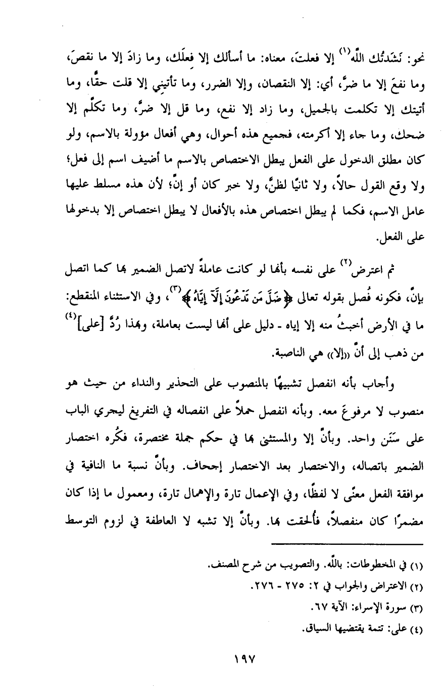وأجاب بأنه انفصل تشبيهاً بالمنصوب علي التحذير والنداء من حيث هو منصوب لا مرفوع معه. وبأنه انفصل حملاً علي انفصاله في التفريغ ليجري الباب علي سنن واحد. وبأن إلا والمستثني بها في حكم جملة مختصرة، فكره واختصار الضمير باتصاله، والاختصار إجحاف. وبأن نسبة ما النافية في موافقة الفعل معني لا لفظاً، وفي الإعمال تارة والإهمال تارة، ومعمول ما إذا كان مضمراً كان منفصلاً، فألحقت بها. وبأن إلا تشبه لا العاطفة في لزوم التوسط