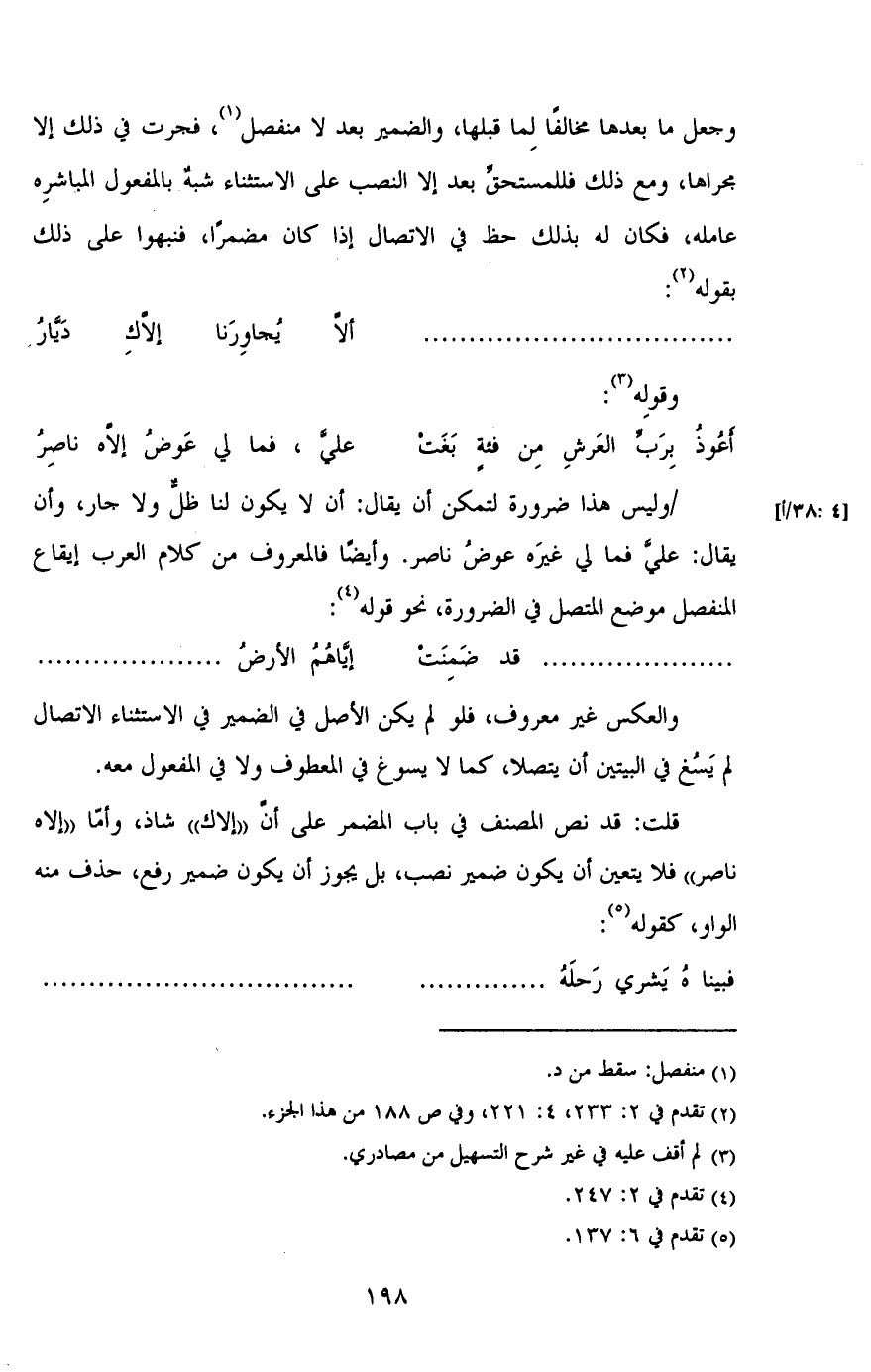 [4: 38/ أ] /وليس هذا ضرورة لتمكن أن يقال: أن لا يكون لنا ظل ولا جار، وأن يقال: علي فما لي غيره عوض ناصر. وأيضاً فالمعروف من كلام العرب إيقاع المنفصل موضوع المتصل في الضرورة، نحو قوله: