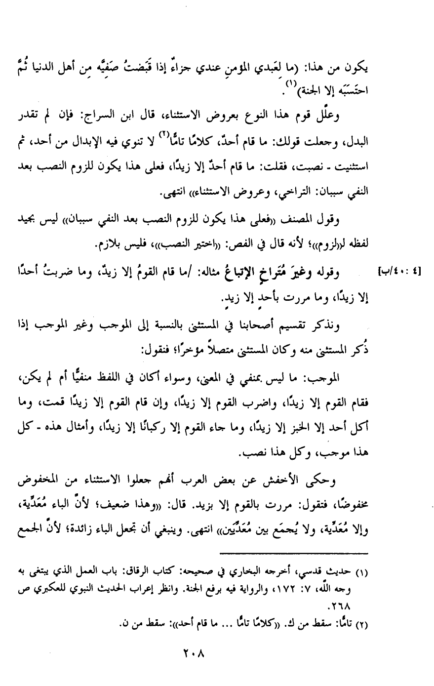 الموجب: ما ليس بمنفي في المعنى, وسواء أكان في اللفظ منفيًا أم لم يكن, فقام القوم إلا زيدًا, واضرب القوم إلا زيدًا, وإن قام القوم إلا زيدًا, وإن قام القوم إلا زيدًا قمت, وما أكل أحد إلا الخبز إلا زيدًا, وما جاء القوم إلا ركبانًا إلا زيدًا, وأمثال هذه- كل هذا موجب, وكل هذا نصب.