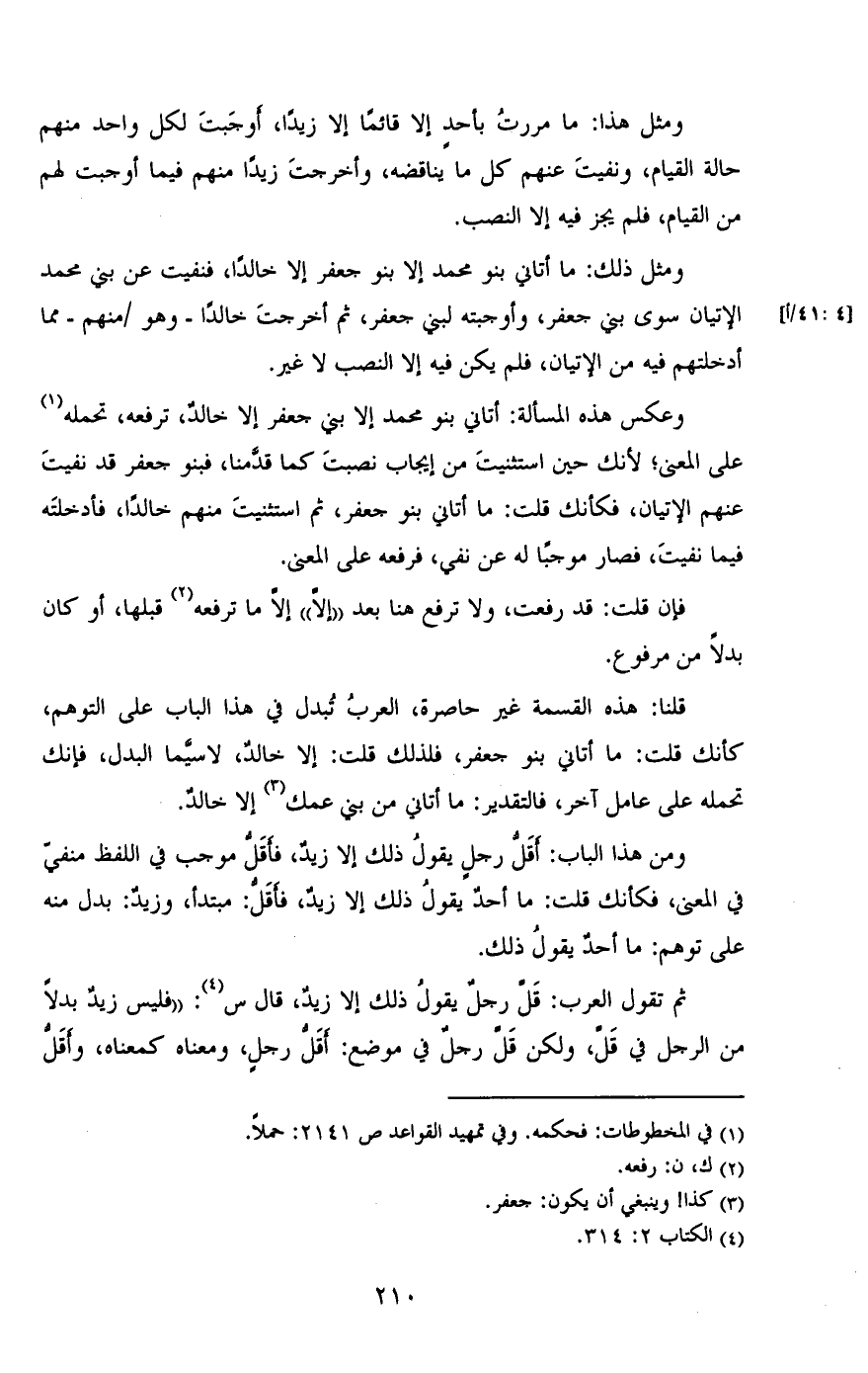 ومثل ذلك: ما أتاني بنو محمد إلا بنو جعفر إلا خالدًا, فنفيت عن بني محمد الإتيان سوى بني جعفر, ثم أخرجت خالدًا- وهو/ [4: 41/أ] منهم- مما أدخلتهم فيه من الإتيان, فلم يكن فيه إلا النصب لا غير.