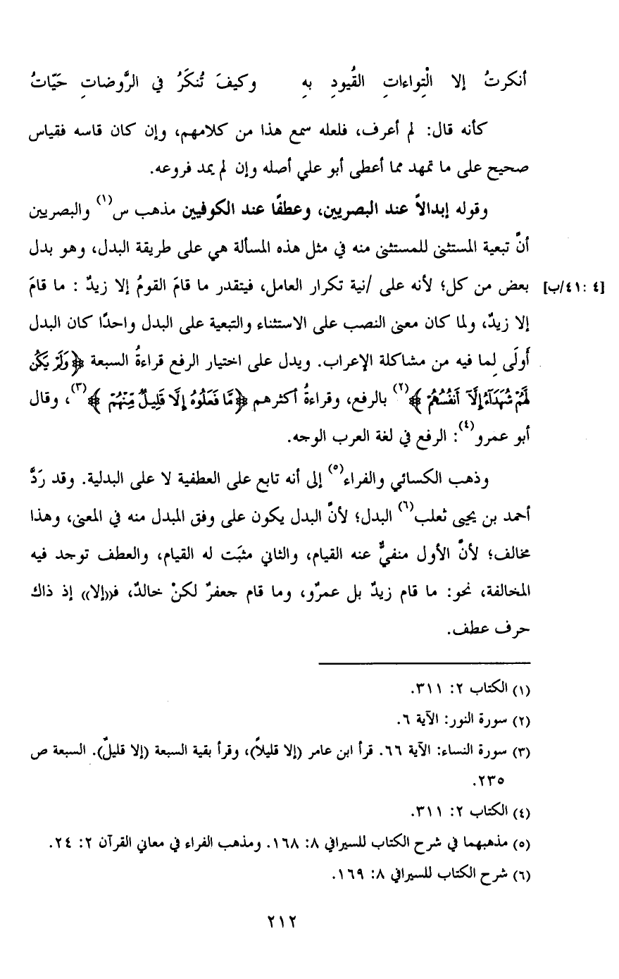 وقوله إبدالاً عند البصريين, وعطفًا عند الكوفيين مذهب س والبصريين أن تبعية المستثنى للمستثنى منه في مثل هذه المسألة هي على طريقة البدل, وهو بدل بعض من كل؛ لأنه على/ [4: 41/ب] تكرار العامل, فيتقدر ما قام القوم إلا زيد: ما قام إلا زيد, ولما كان معنى النصب على الاستثناء والتبعية على البدل واحدًا كان البدل أولى لما فيه من مشاكله الإعراب. ويدل على اختيار الرفع قراءة السبعة {ولَمْ يَكُن لَّهُمْ شُهَدَاءُ إلاَّ أَنفُسُهُمْ} بالرفع, وقراءة أكثرهم {مَّا فَعَلُوهُ إلاَّ قَلِيلٌ مِّنْهُمْ} , وقال أبو عمرة: الرفع في لغة العرب الوجه.