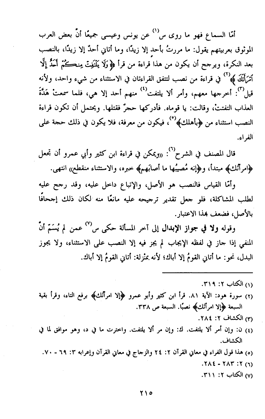 قال المصنف في الشرح: "ويمكن في قراءة ابن كثير وأبي عمرو أن تجعل {امْرَأَتَكَ} مبتدأ, و {إنَّهُ مُصِيبُهَا مَا أَصَابَهُمْ} خبره, والاستثناء منقطع" انتهى.