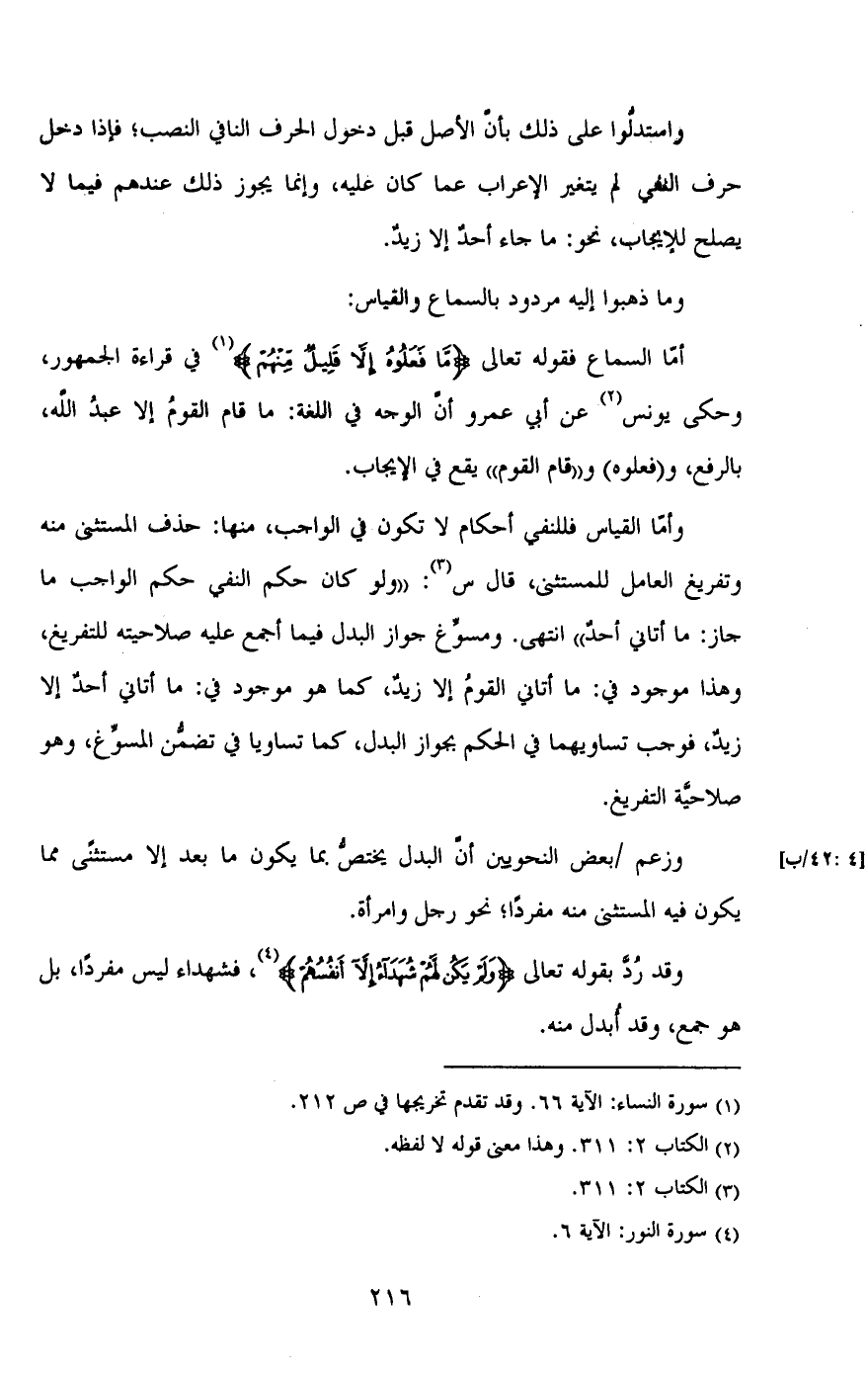 أما السماع فقوله تعالى {مَّا فَعَلُوهُ إلاَّ قَلِيلٌ مِّنْهُمْ} في قراءة الجمهور, وحكي يونس عن أبي عمرو أن الوجه في اللغة: ما قام القوم إلا عبد الله, بالرفع, و (فعلوه) و"قام القوم" يقع في الإيجاب.