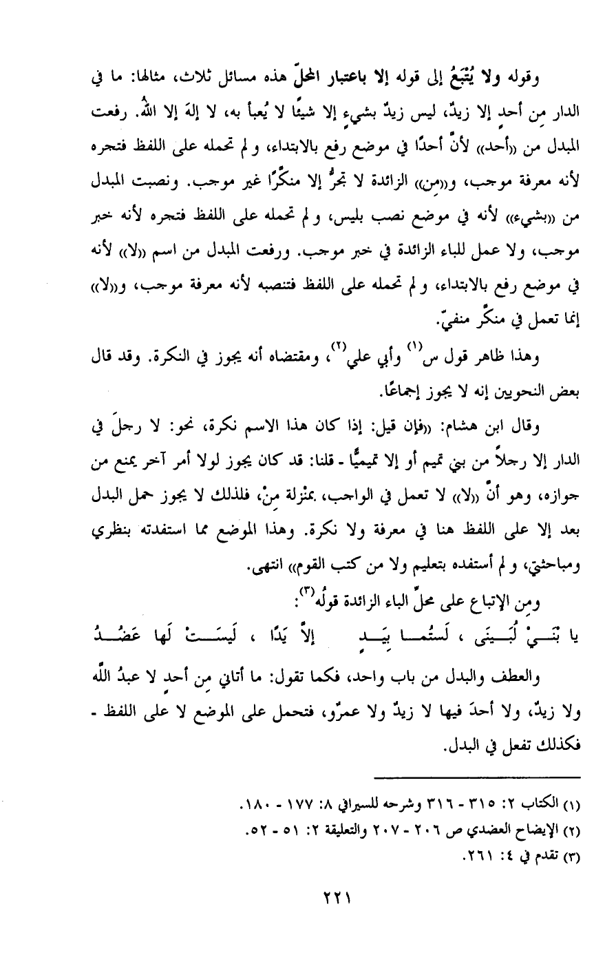 وقوله ولا يتبع إلى قوله إلا باعتبار المحل هذه مسائل ثلاث, مثالها: ما في الدار من أحد إلا زيد, ليس زيد بشيء إلا شيئًا لا يعبأ به, لا إله إلا الله. رفعت المبدل من "أحد" لأن أحدًا في موضع رفع بالابتداء, ولم تحمله على اللفظ فتجره لأن معرفة موجب, و"من" الزائدة لا تجر إلا منكرًا غير موجب. ونصبت المبدل من "بشيء" لأنه في موضع نصب إبليس, ولم تحمله على اللفظ فتجره لأنه خبر موجب, ولا عمل للباء الزائدة في خبر موجب. ورفعت المبدل من اسم "لا" لأنه في موضع رفع بالابتداء, ولم تحمله على اللفظ فتنصبه لأنه معرفة موجب, و"لا" إنما تعمل في منكر منفي.