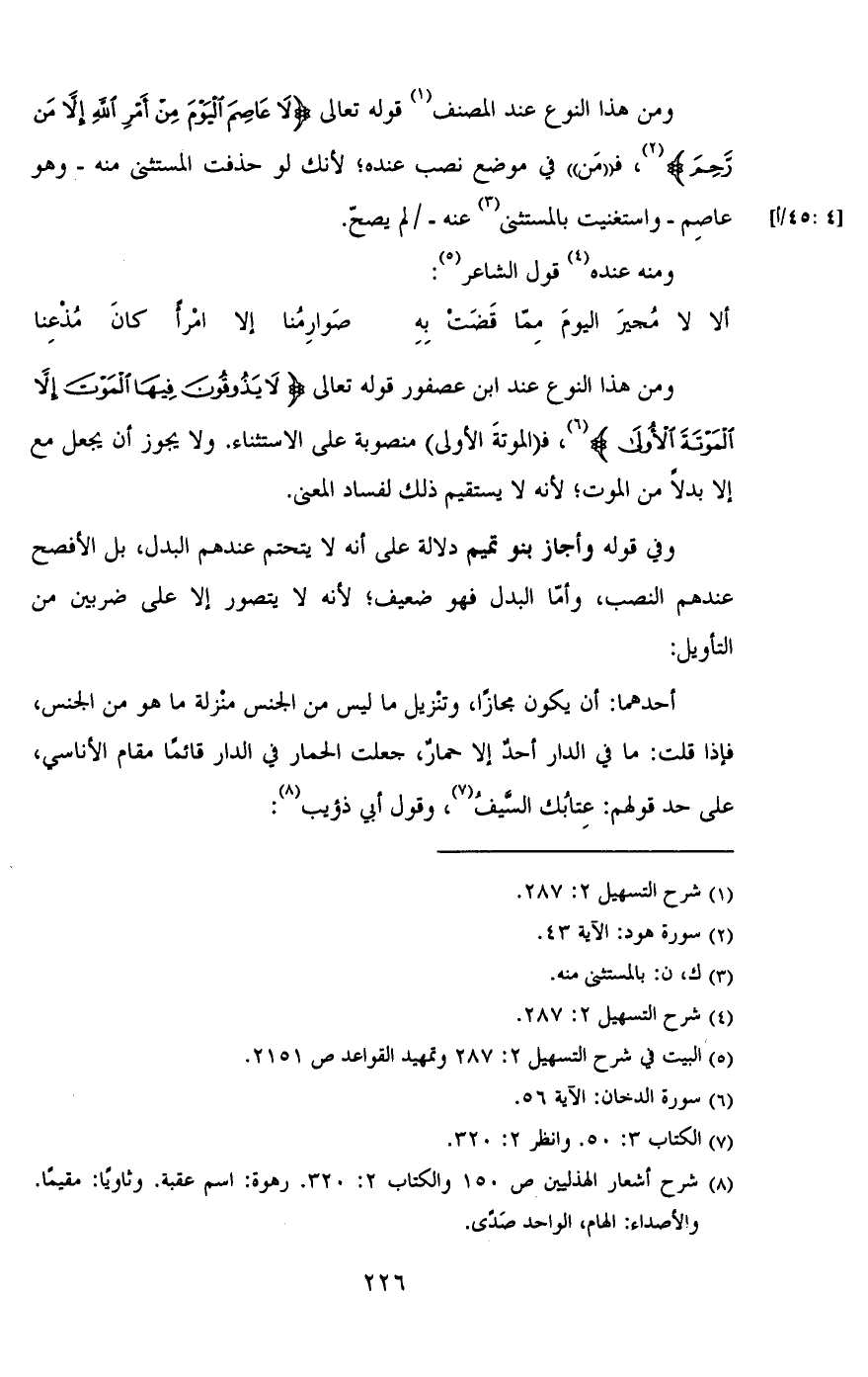 ومن هذا النوع عند المصنف قوله تعالى {لا عَاصِمَ اليَوْمَ مِنْ أَمْرِ اللَّهِ إلاَّ مَن رَّحِمَ}، ف"من" في موضع نصب عنده؛ لأنك لو حذفت المستثنى منه- وهو عاصم- واستغنيت بالمستثنى عنه -/ [4: 45/أ] لم يصح.