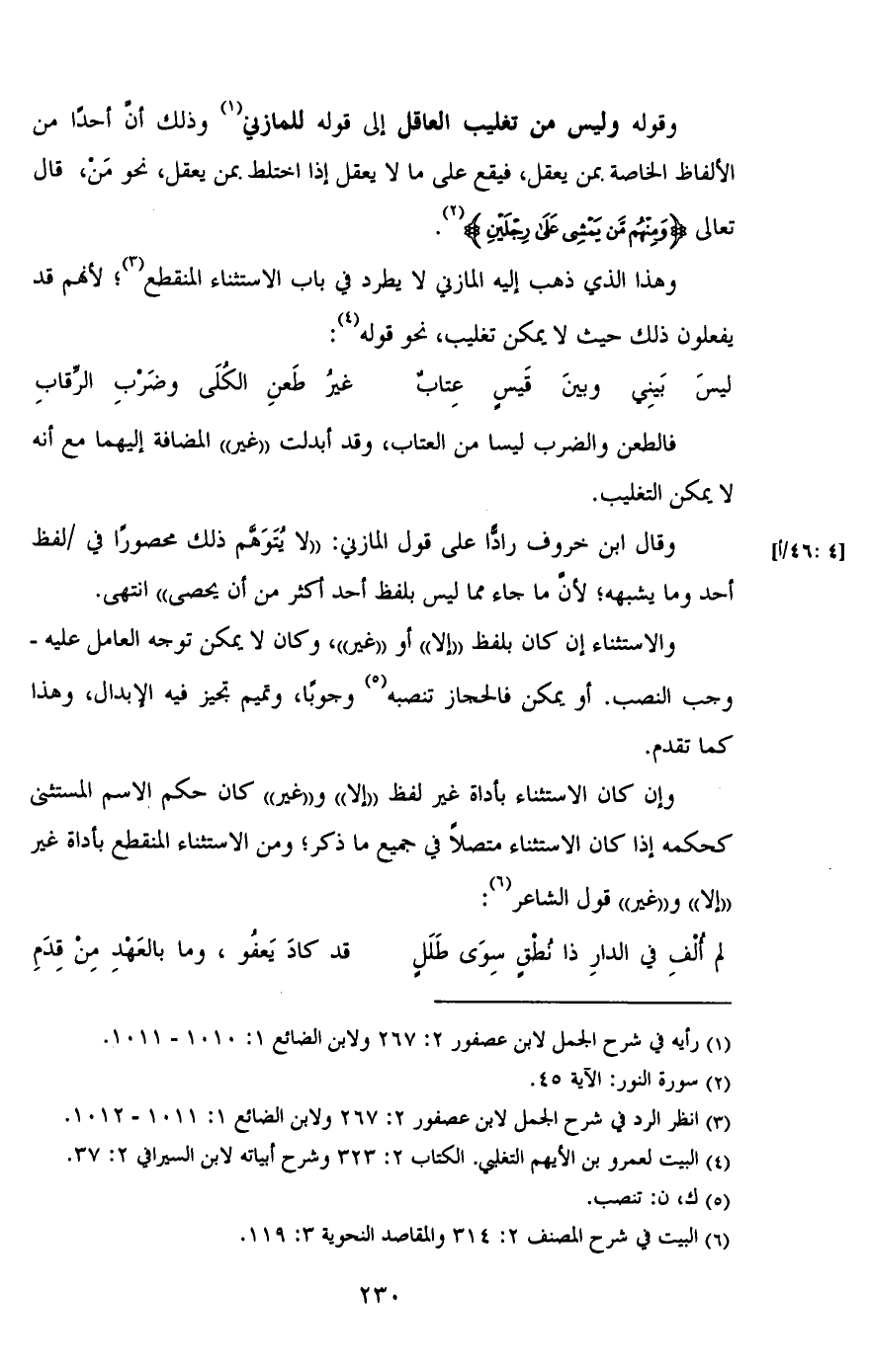 وهذا الذي ذهب إليه المازني لا يطرد في باب الاستثناء المنقطع؛ لأنهم قد يفعلون ذلك حيث لا يمكن تغليب، نحو قوله: