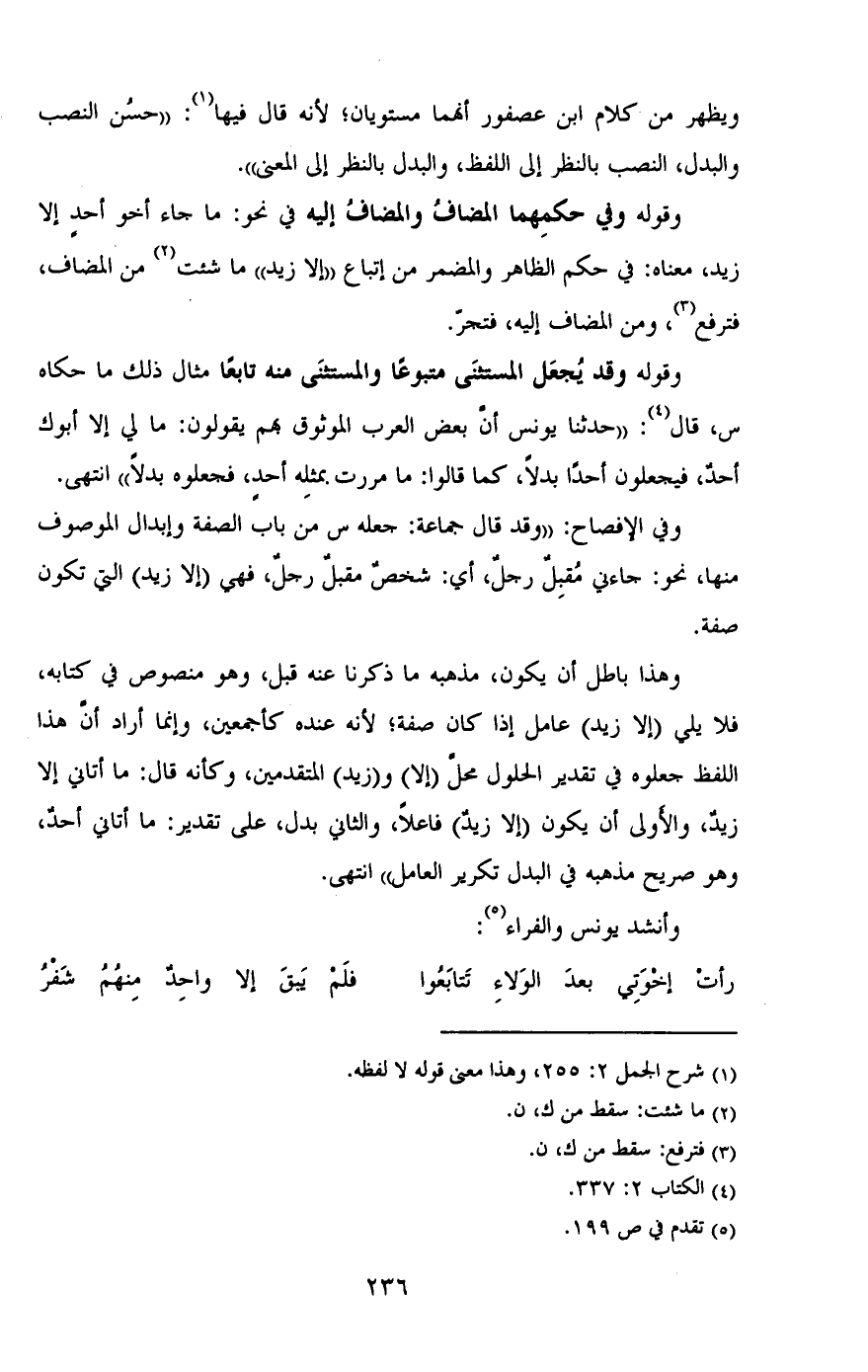 وقوله وقد يجعل المستثنى متبوعًا والمستثنى منه تابعًا مثال ذلك ما حكاه س، قال: "حدثنا يونس أن بعض العرب الموثوق بهم يقولون: ما لي إلا أبوك أحدٌ، فيجعلون أحدًا بدلًا، كما قالوا: ما مررت بمثله أحدٍ، فجعلوه بدلًا" انتهى.