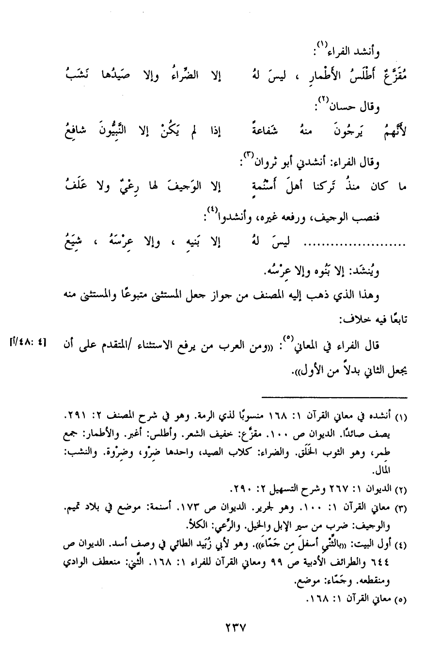 قال الفراء في المعاني: "ومن العرب من يرفع الاستثناء / [4: 48/ أ] المتقدم على أن يجعل الثاني بدلًا من الأول".