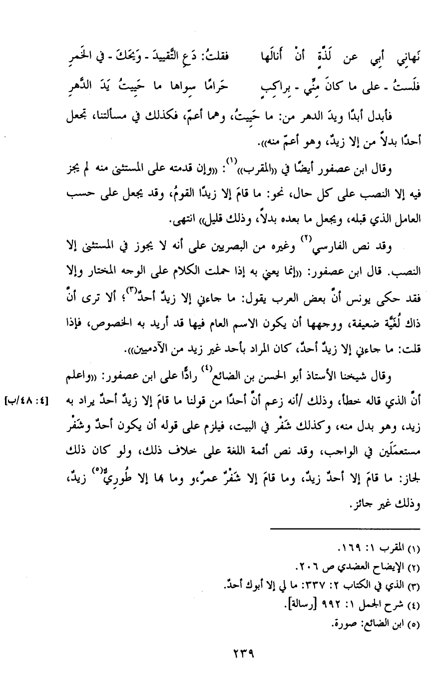 وقال شيخنا الأستاذ أبو الحسن بن الضائع رادًا على ابن عصفور: "واعلم أن الذي قاله خطأ، وذلك / [4: 48/ ب] أنه زعم أن أحدًا من قولنا ما قام إلا زيدٌ أحدٌ يراد به زيد، وهو بدل منه، وكذلك شفر في البيت، فيلزم على قوله أن يكون أحدٌ وشفر مستعملين في الواجب، وقد نص أئمة اللغة على خلاف ذلك، ولو كان ذلك لجاز: ما قام إلا أحدٌ زيدٌ، وما قام إلا شفرٌ عمرٌ، ووما بها إلا طوريٌ زيدٌ، وذلك غير جائز.