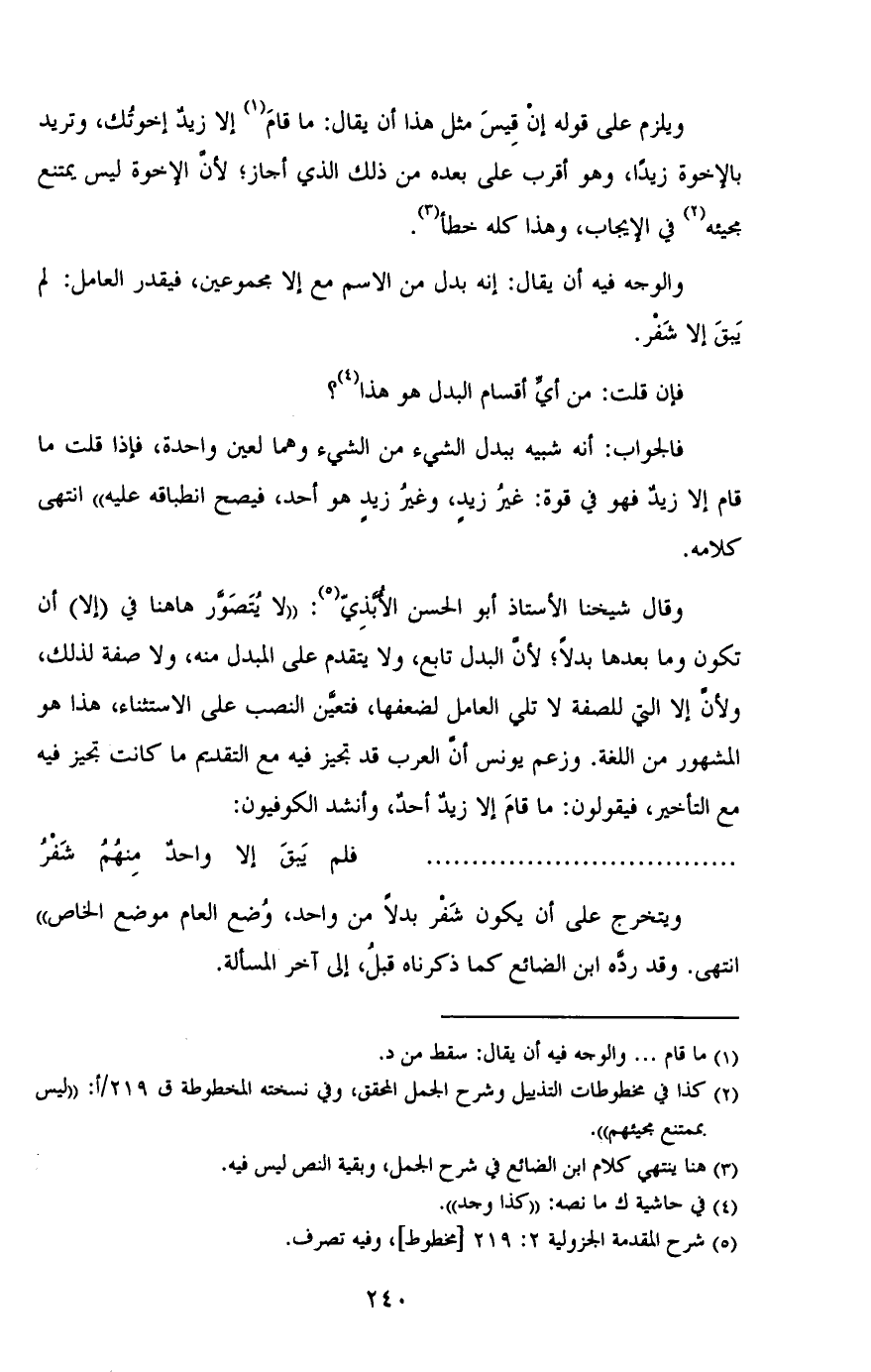 ويلزم على قوله إن قيس مثل هذا أن يقال: ما قام إلا زيدٌ إخوتك، وتريد بالإخوة زيدًا، وهو أقرب على بعده من ذلك الذي أجاز؛ لأن الإخوة ليس يمتنع مجيئه في الإيجاب، وهذا كله خطأ.