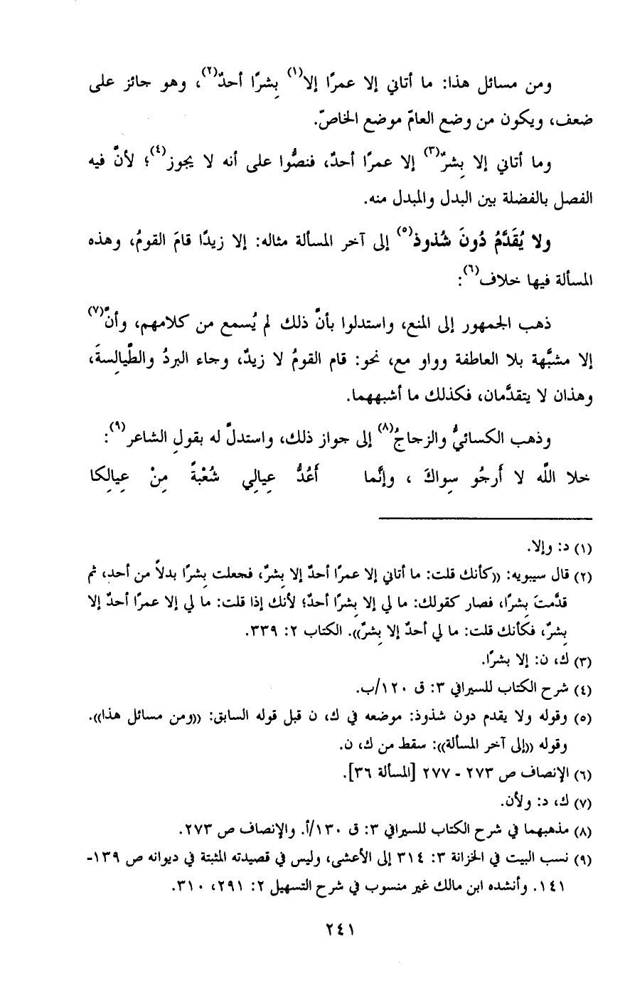 وما أتاني إلا بشرٌ إلا عمرًا أحدٌ، فنصوا على أنه لا يجوز؛ لأن فيه الفصل بالفضلة بين البدل والمبدل منه.