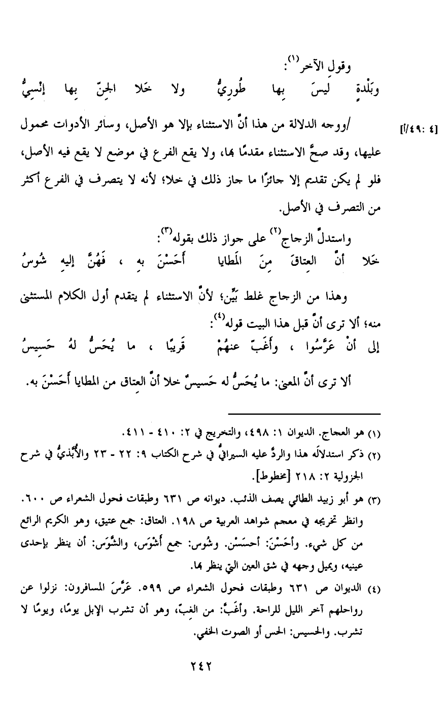 [4: 49/ أ] / ووجه الدلالة من هذا أن الاستثناء بإلا هو الأصل، وسائر الأدوات محمول عليها، وقد صح الاستثناء مقدمًا بها، ولا يقع الفرع في موضع لا يقع فيه الأصل، فلو لم يكن تقديم إلا جائزًا ما جاز ذلك في خلا؛ لأنه لا يتصرف في الفرع أكثر من التصرف في الأصل.