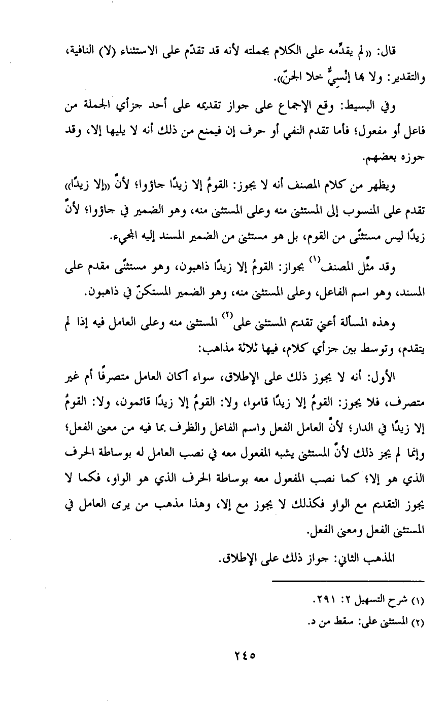 وقد مثل المصنف بجواز: القوم إلا زيدًا ذاهبون، وهو مستثنى مقدم على المسند، وهو اسم الفاعل، وعلى المستثنى منه، وهو الضمير المستكن في ذاهبون.