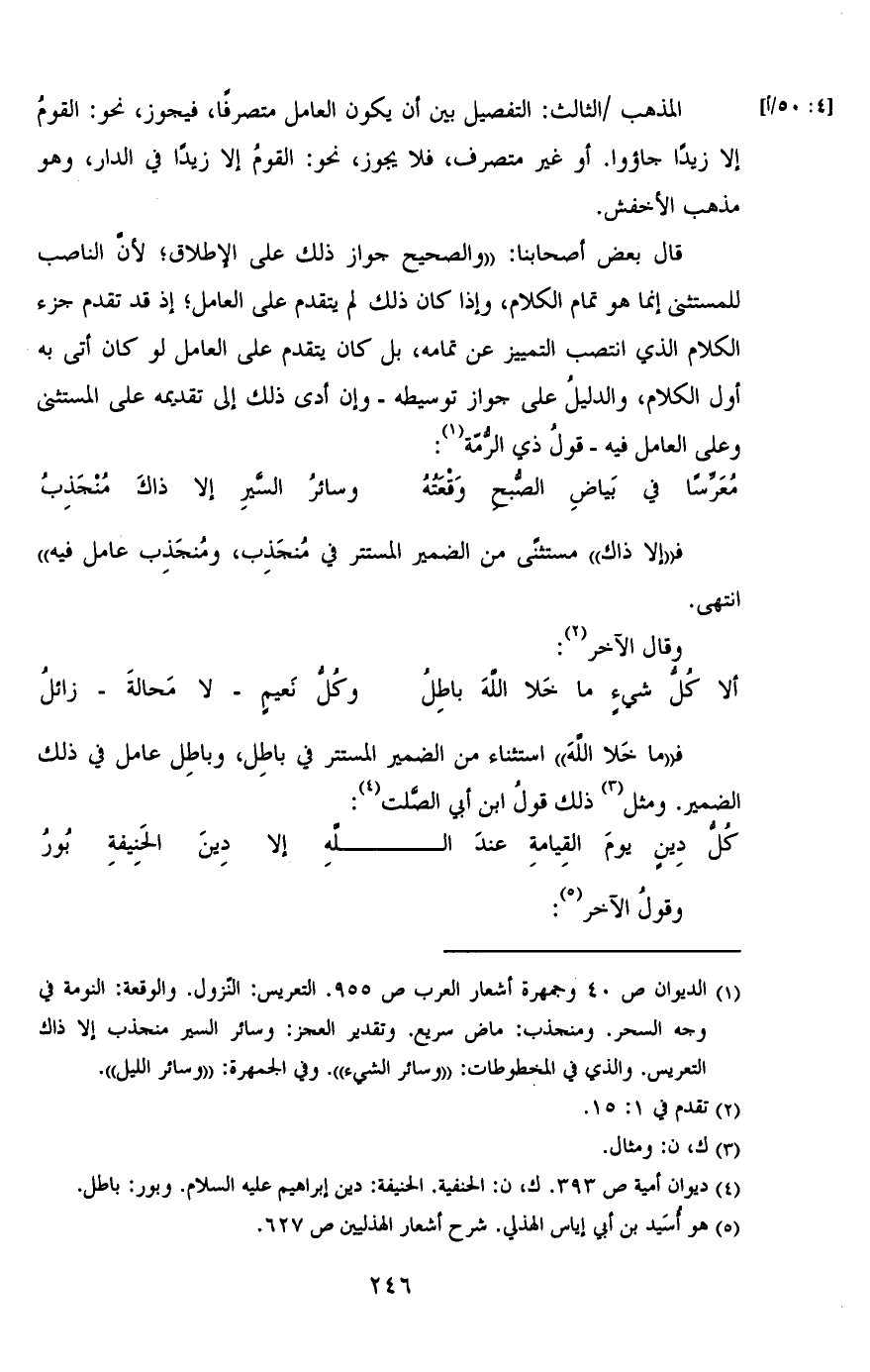 المذهب/ [4: 49/ ب] الثالث: التفصيل بين أن يكون العامل متصرفًا، فيجوز، نحو: القوم إلا زيدًا جاؤوا. أو غير متصرف، فلا يجوز، نحو: القوم إلا زيدًا في الدار، وهو مذهب الأخفش.