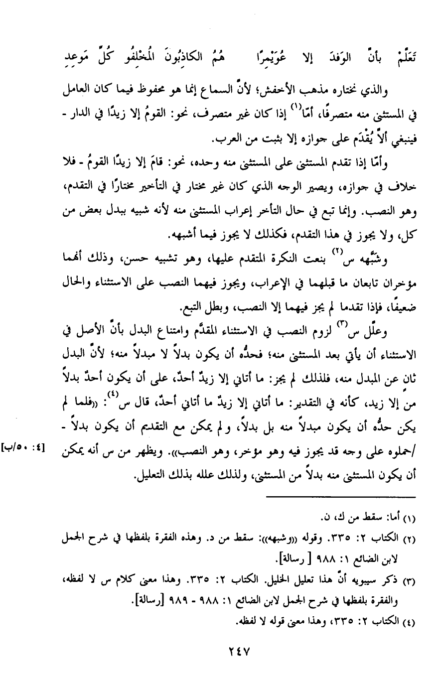وعلل س لزوم النصب في الاستثناء المقدم وامتناع البدل بأن الأصل في الاستثناء أن يأتي بعد المستثنى منه؛ فحده أن يكون بدلًا لا مبدلًا منه؛ لأن البدل ثان عن المبدل منه، فلذلك لم يجز: ما أتاني إلا زيدٌ أحدٌ، على أن يكون أحدٌ بدلًا من إلا زيد، كأنه في التقدير: ما أتاني إلا زيدٌ ما أتاني أحدٌ، قال س: "فلما لم يكن حده أن يكون مبدلًا منه بل بدلًا، ولم يمكن مع التقديم أن يكون بدلًا - / [4: 50/ ب] حملوه على وجه قد يجوز فيه وهو مؤخر، وهو النصب". ويظهر من س أنه يمكن أن يكون المستثنى منه بدلًا من المستثنى، ولذلك علله بذلك التعليل.