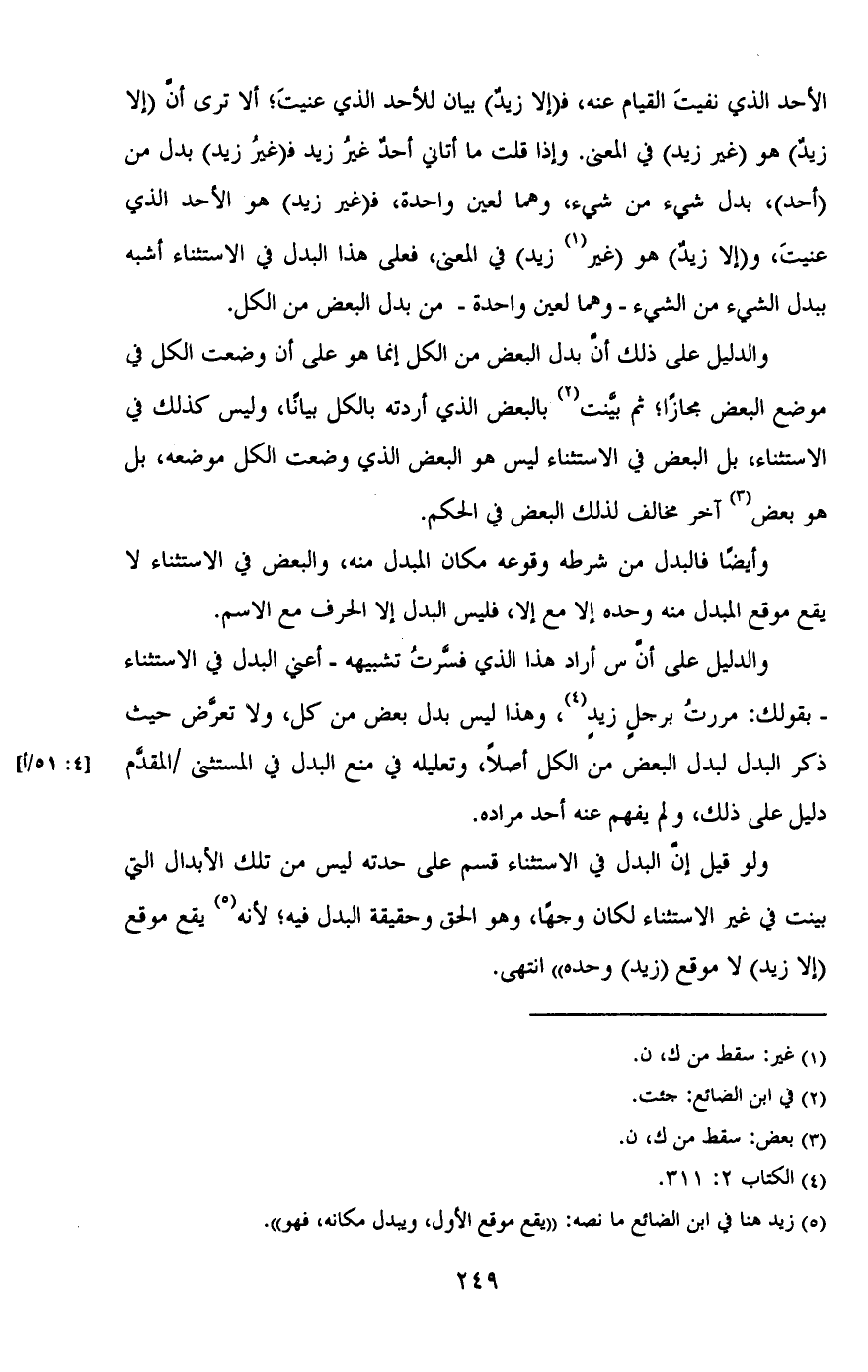 والدليل على أن س أراد هذا الذي فسرت تشبيهه - أعني البدل في الاستثناء - بقولك: مررت برجلٍ زيدٍ، وهذا ليس بدل بعض من كل، ولا تعرض حيث ذكر البدل لبدل البعض من الكل أصلًا، وتعليله في منع البدل في المستثنى / [4: 51/ ا] المقدم دليل على ذلك، ولم يفهم عنه أحد مراده.