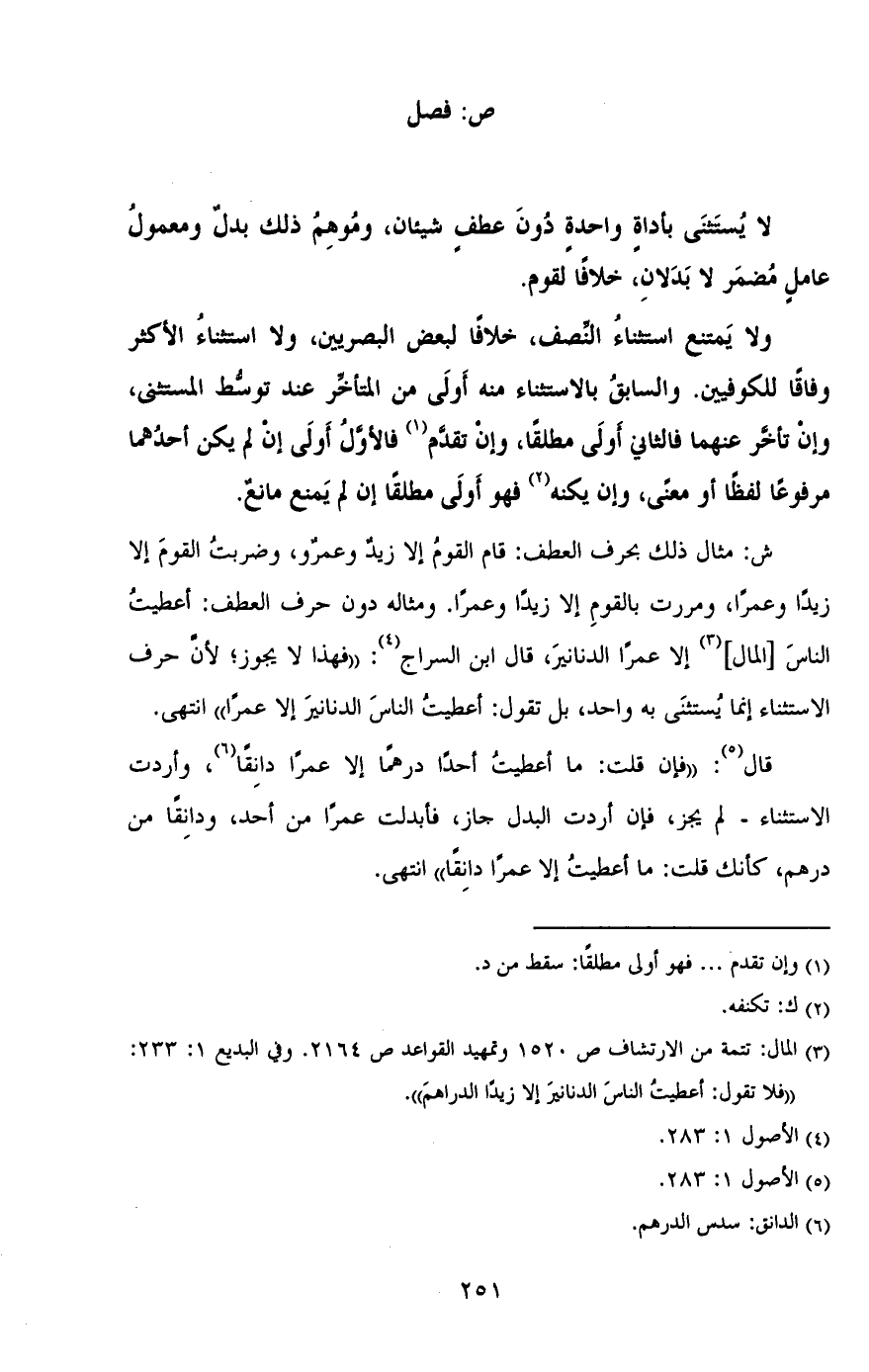 ش: مثال ذلك بحرف العطف: قام القوم إلا زيدٌ وعمرو، وضربت القوم إلا زيدًا وعمرًا، ومررت بالقوم إلا زيدًا وعمرًا. ومثاله دون حرف العطف: أعطيت الناس [المال] إلا عمرًا الدنانير، قال ابن السراج: "فهذا لا يجوز؛ لأن حرف الاستثناء إنما يُستثنى به واحد، بل تقول: أعطيت الناس الدنانير إلا عمرًا" انتهى.