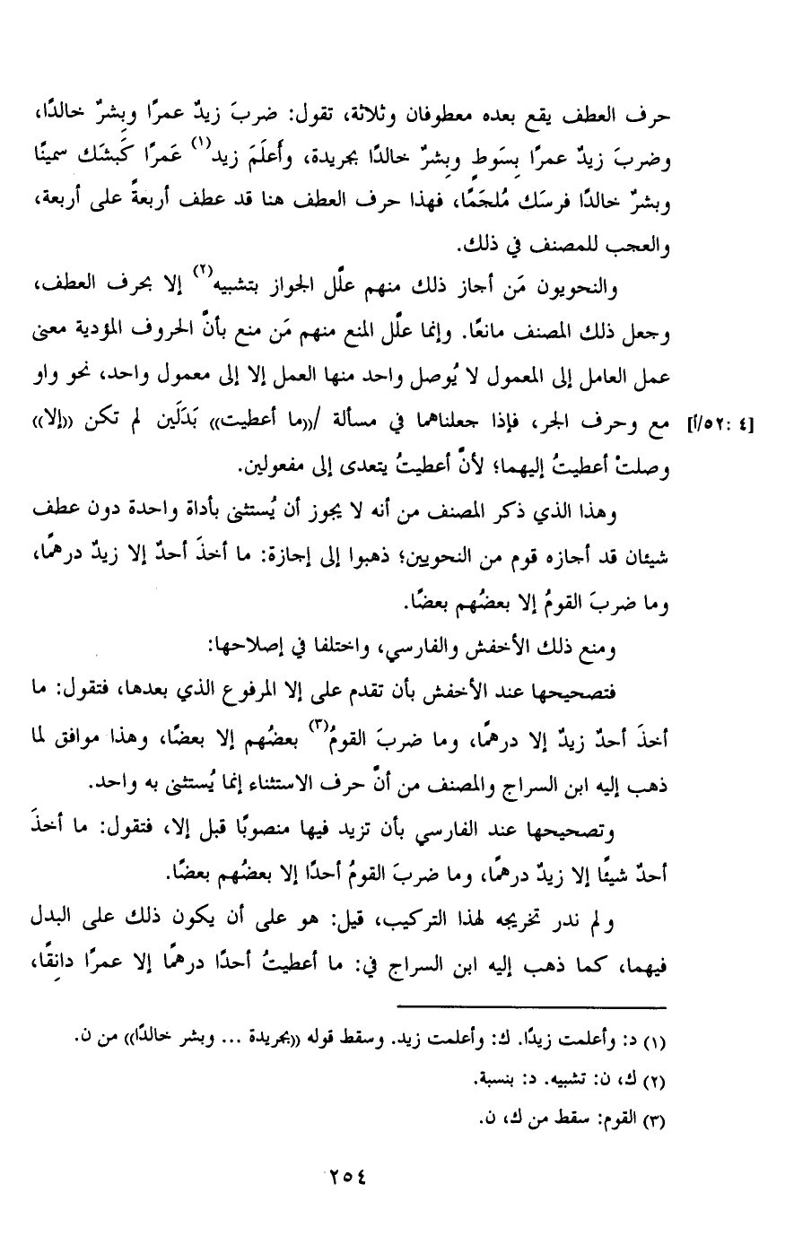 حرف العطف يقع بعده معطوفان وثلاثة، تقول: ضرب زيدٌ عمرًا وبشرٌ خالدًا، وضرب زيدٌ عمرًا بسوطٍ وبشرٌ خالدًا بجريدة، وأعلم زيد عمرًا كبشك سمينًا وبشرٌ خالدًا فرسك مُلجمًا، فهذا حرف العطف هنا قد عطف أربعةً على أربعة، والعجب للمصنف في ذلك.