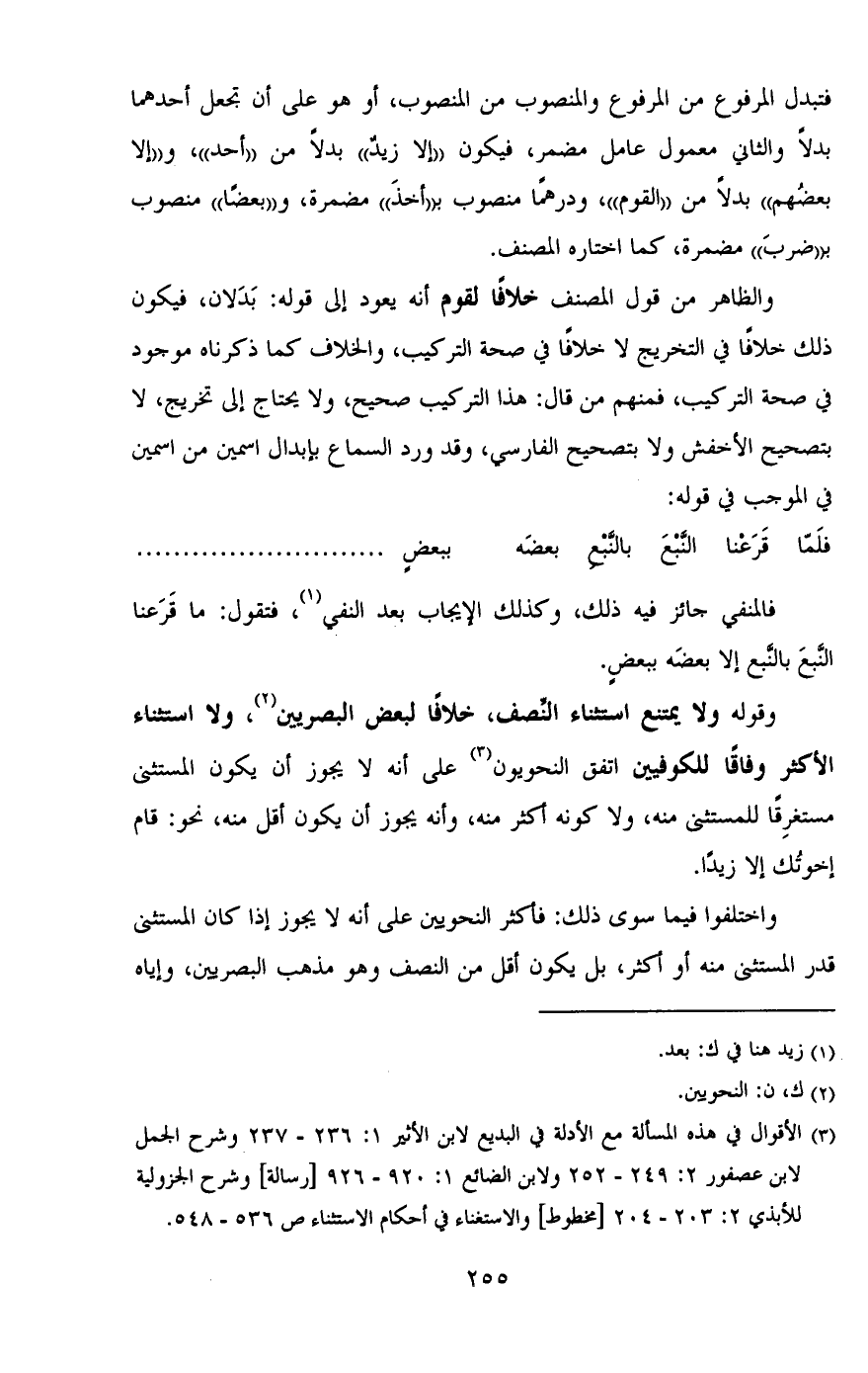 واختلفوا فيما سوى ذلك: فأكثر النحويين على أنه لا يجوز إذا كان المستثنى قدر المستثنى منه أو أكثر، بل يكون أقل من النصف وهو مذهب البصريين، وإياه