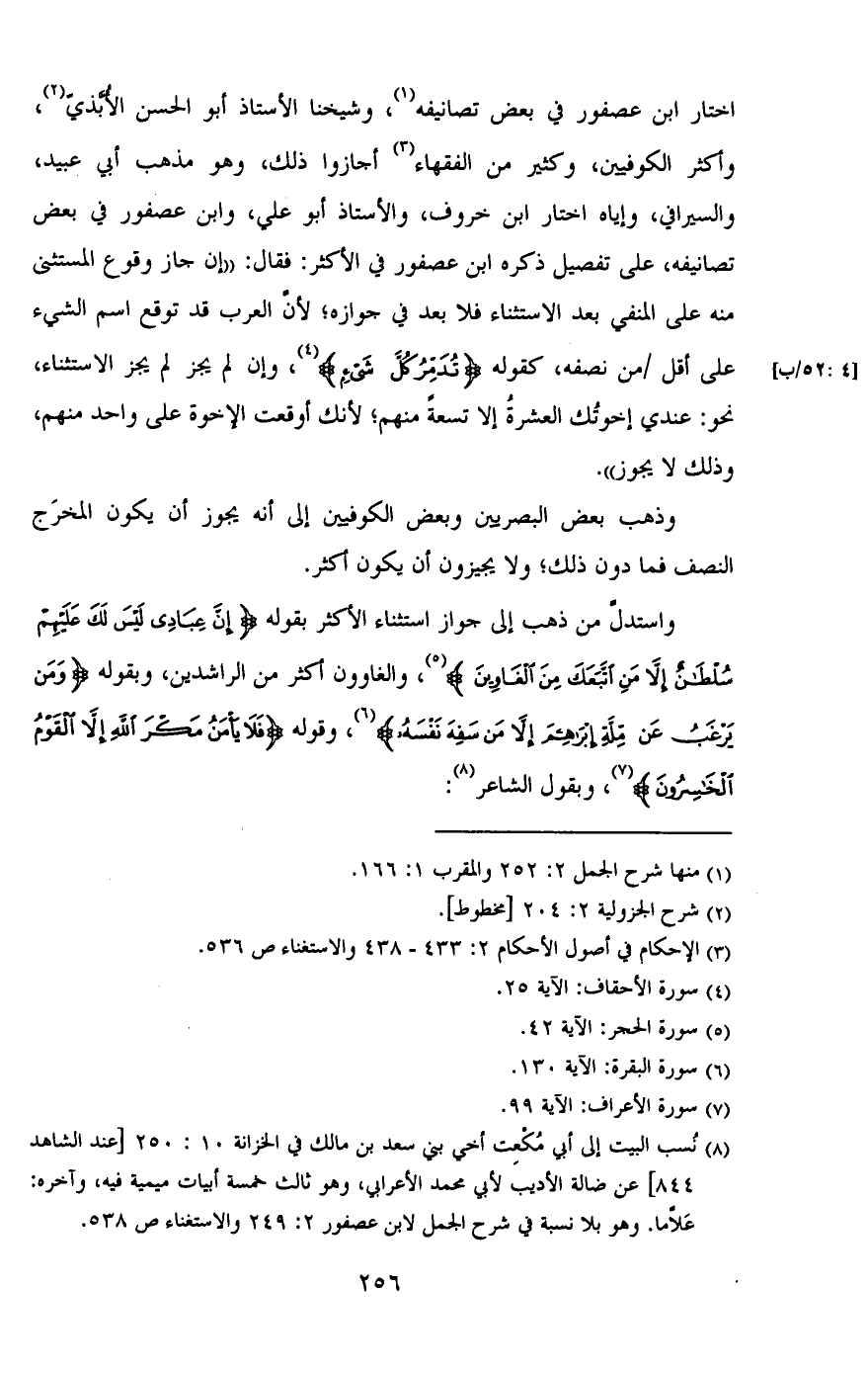 واستدل من ذهب إلى جواز استثناء الأكثر بقوله {إنَّ عِبَادِي لَيْسَ لَكَ عَلَيْهِمْ سُلْطَانٌ إلاَّ مَنِ اتَّبَعَكَ مِنَ الغَاوِينَ}، والغاوون أكثر من الراشدين، وبقوله {ومَن يَرْغَبُ عَن مِّلَّةِ إبْرَاهِيمَ إلاَّ مَن سَفِهَ نَفْسَهُ}، وقوله {فَلا يَامَنُ مَكْرَ اللَّهِ إلاَّ القَوْمُ الخَاسِرُونَ}، وبقول الشاعر: