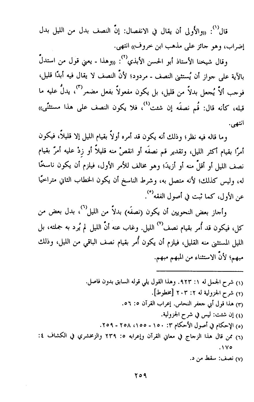 وما قاله فيه نظر؛ وذلك أنه يكون قد أمره أولًا بقيام الليل إلا قليلًا، فيكون أمرًا بقيام أكثر الليل، وتقدير قم نصفه أو انقص منه قليلًا أو زد عليه أمرٌ بقيام نصف الليل أو أقل منه أو أزيد؛ وهو مخالف للأمر الأول، فيلزم أن يكون ناسخًا له، وليس كذلك؛ لأنه متصل به، وشرط الناسخ أن يكون الخطاب الثاني متراخيًا عن الأول، كما ثبت في أصول الفقه.