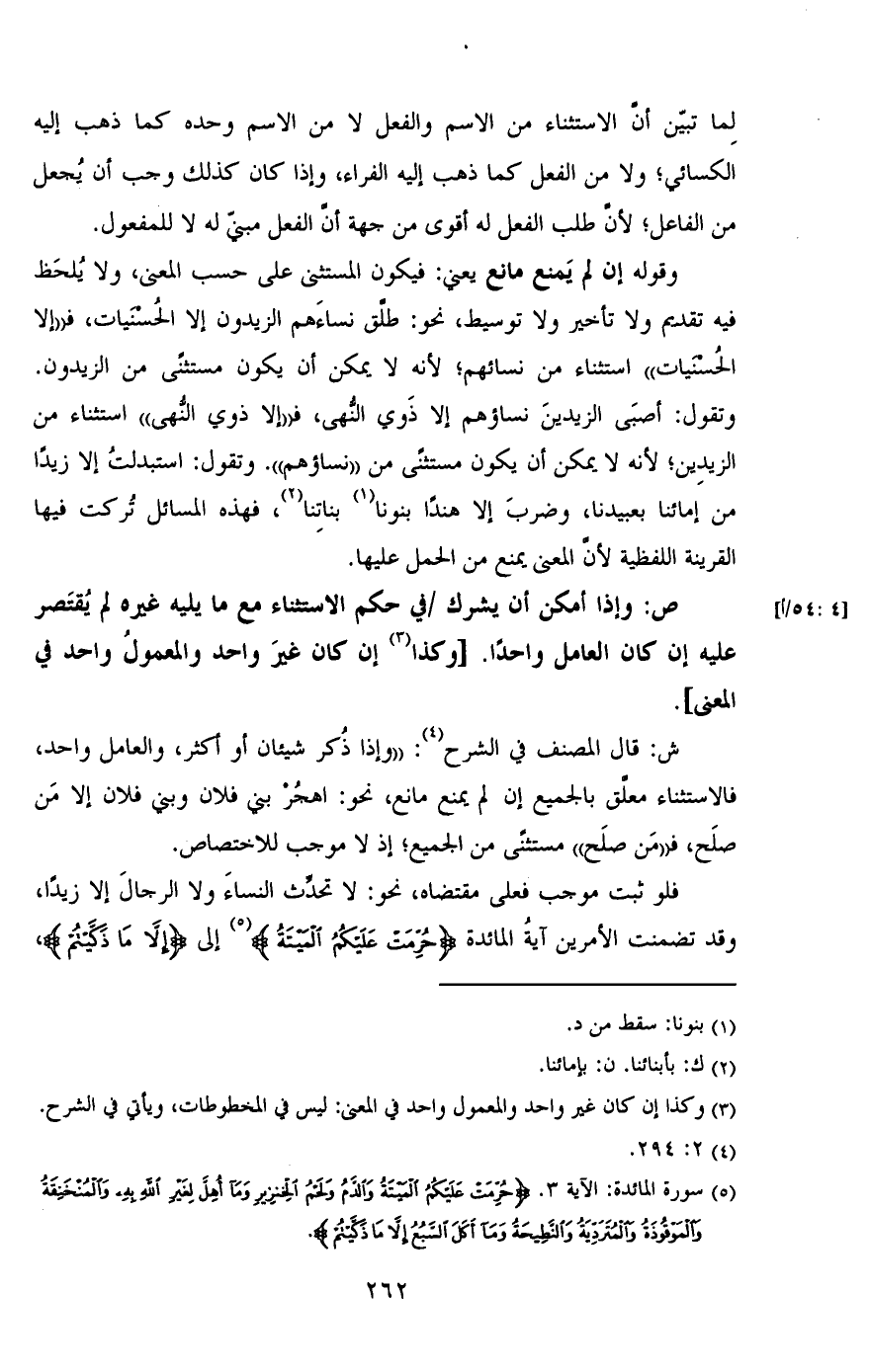 وقوله إن لم يمنع مانع يعني: فيكون المستثنى على حسب المعنى, ولا يلحظ فيه تقديم ولا تأخير ولا توسيط, نحو: طلق نساءهم الزيدون إلا الحسنيات, فـ"إلا الحسنيات" استثناء من نسائهم؛ لأنه لا يمكن أن يكون مستثنى من الزيدون. وتقول: أصبى الزيدين نسائهم إلا ذوي النهى, فـ"إلا ذوي النهي" استثناء من الزيدين؛ لأنه لا يمكن أن يكون مستثنى من "نساؤهم", وتقول: استبدلت إلا زيدًا من إمائنا بعبيدنا, وضرب إلا هندا بنونا بناتنا, فهذه المسائل تركت فيها القرينة اللفظية لأن المعنى يمنع من الحمل عليها.